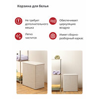 Объем корзины составляет 65 литров, что позволяет вместить большое количество белья или игрушек. Размеры корзины составляют 460 x 270 x 530 мм, а упаковка осуществляется в пакет с клапаном.