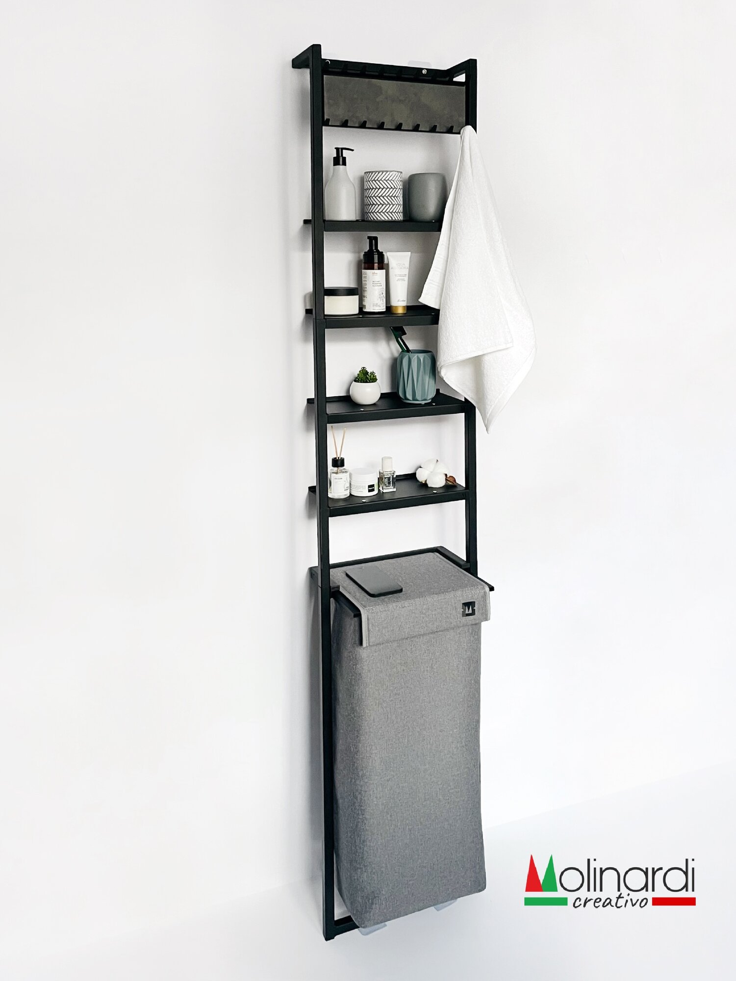 Корзина для белья и стеллажом с полками для хранения узкая