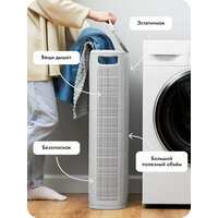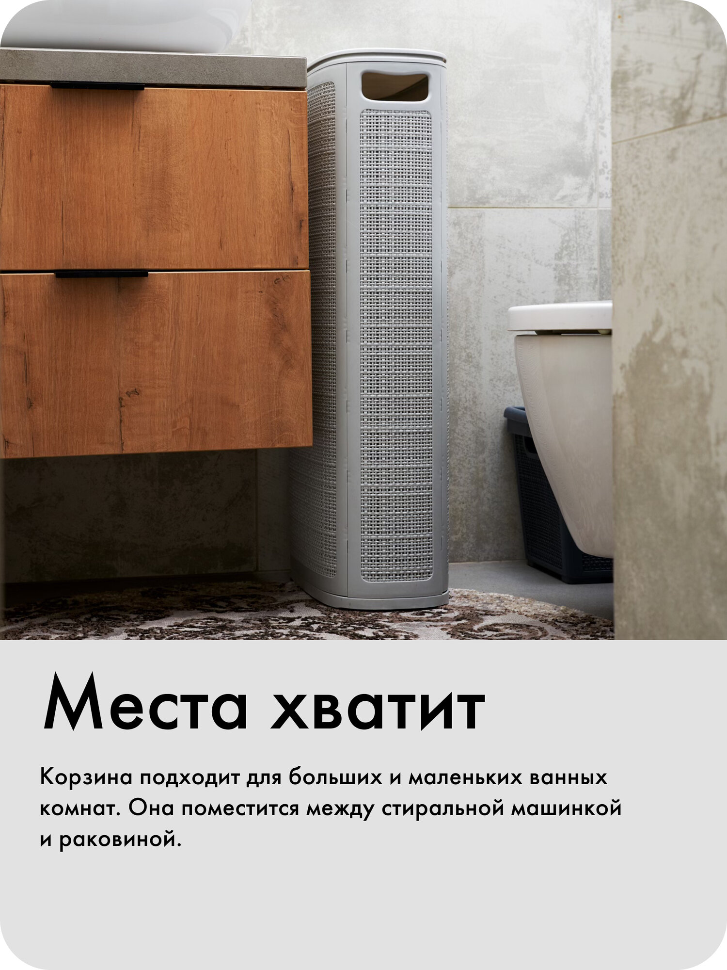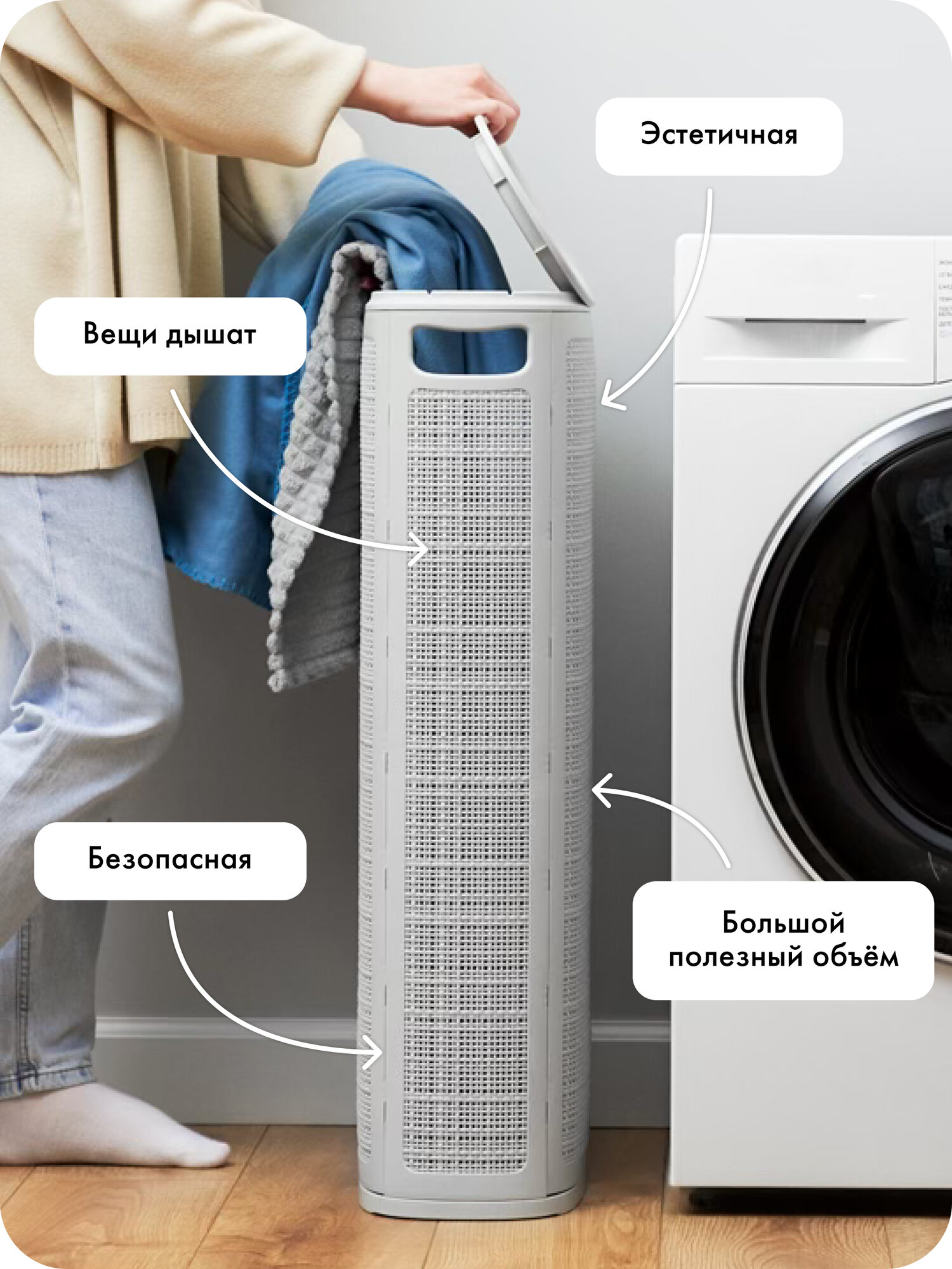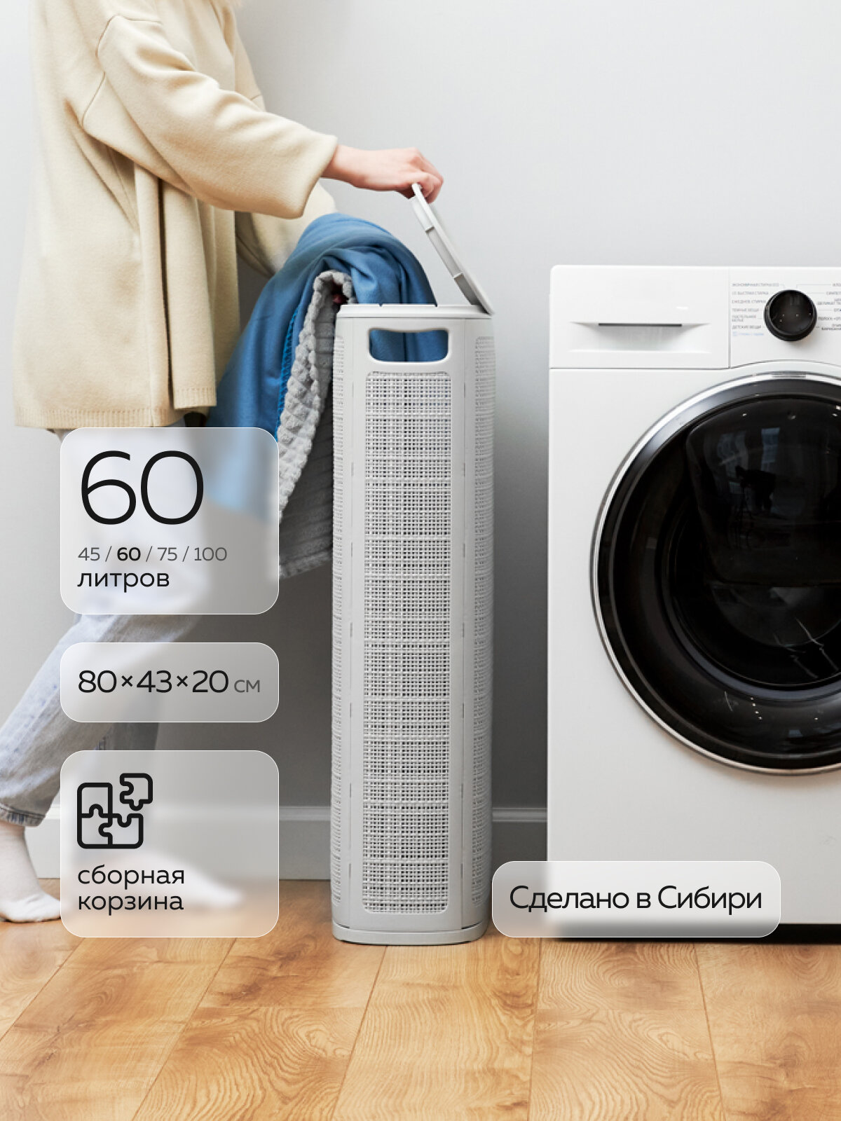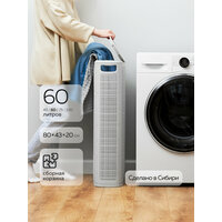 Полезный объём корзины 60 литров. Через стенки корзины проходит воздух — вещи дышат и не преют. По бокам корзины есть ручки, они не режут ладони. Заполненную корзину можно хранить в любой комнате, а когда нужно, перенести в ванную или постирочную.