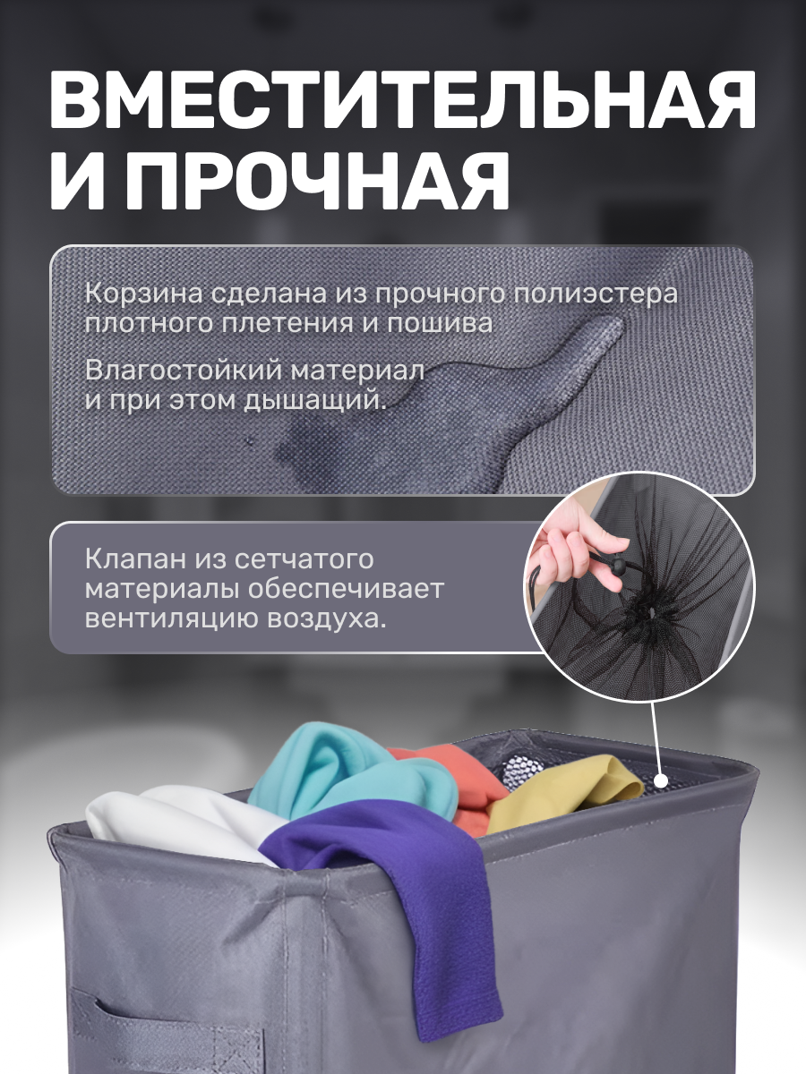 Ткань корзины для белья прочная, не линяет и не деформируется, сохраняя свой привлекательный внешний вид на протяжении длительного времени.
