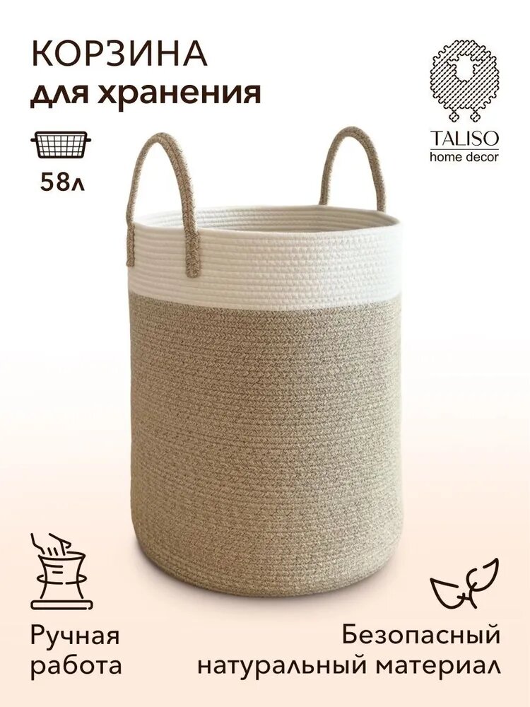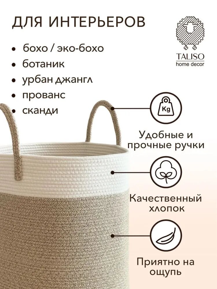 Стильная и практичная корзина для белья бренда "Taliso" решит проблемы хранения вещей в гостиной, ванной, детской, спальне и других помещениях вашего дома. Корзина плетеная для хранения служит предметом искусства и добавит уюта и станет приятным дополнением интерьера. Корзина для хранения игрушек изготовлена из 100% хлопковой веревки, что является экологичным материалом без каких-либо химикатов. Поэтому корзина для хранения вещей подойдет для детской одежды и игрушек. Корзина для игрушек не царапает кожу ребенка, а также деревянный пол, если вдруг маленькое чудо решит поиграть и с самой плетеной корзиной. Мягкая, складная корзина для грязного белья достаточно прочная, чтобы стоять сама по себе, даже если она пуста. Корзина для белья в ванную плетеная имеет прочные и удобные ручки, которые позволяют без труда перемещать хлопковую корзину в нужное место. Корзина для хранения белья размером 38х50 см - это вместительный органайзер, который позволяет убрать много вещей, занимая при этом совсем немного места. Поэтому корзина для хранения это отличное средство для борьбы с беспорядком дома или на даче. Корзина круглая плетеная из хлопка заменит и ящик для игрушек, корзина для пакетов, ящик для белья, кашпо для комнатных растений, корзина для пикника. Корзина для белья плетеная представлена в нашем магазине в разных расцветках, поэтому Вы без труда сможете подобрать нужный оттенок, который отлично впишется в ваш интерьер. Так же плетеная корзина станет отличным подарком любимой, жене, маме, бабушке, сестре, коллеге, подруге на любой праздник, будь то свадьба или новоселье, день рождения или 8 марта, а также и Новый год. Обратите внимание! Корзина плетеная с ручками поставляется в сложенном виде. Для восстановления формы рекомендуется для белья корзину туго заполнить объемными вещами на 1-2 дня (идеальный вариант - подушки и одеяла). Так же можно для игрушек корзину отпарить утюгом, предварительно опрыскав водой. Очень стильная и долговечная плетеная корзина для хранения, придаст уют вашему дому и будет непременно радовать взор!