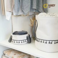 Бельевая корзина имеет большую вместимость, поэтому удобна для хранения габаритных вещей: пледов и зимней одежды. Тканевая корзина для белья затягивается веревкой сверху, если нужно скрыть содержимое или надёжно защитить от пыли.