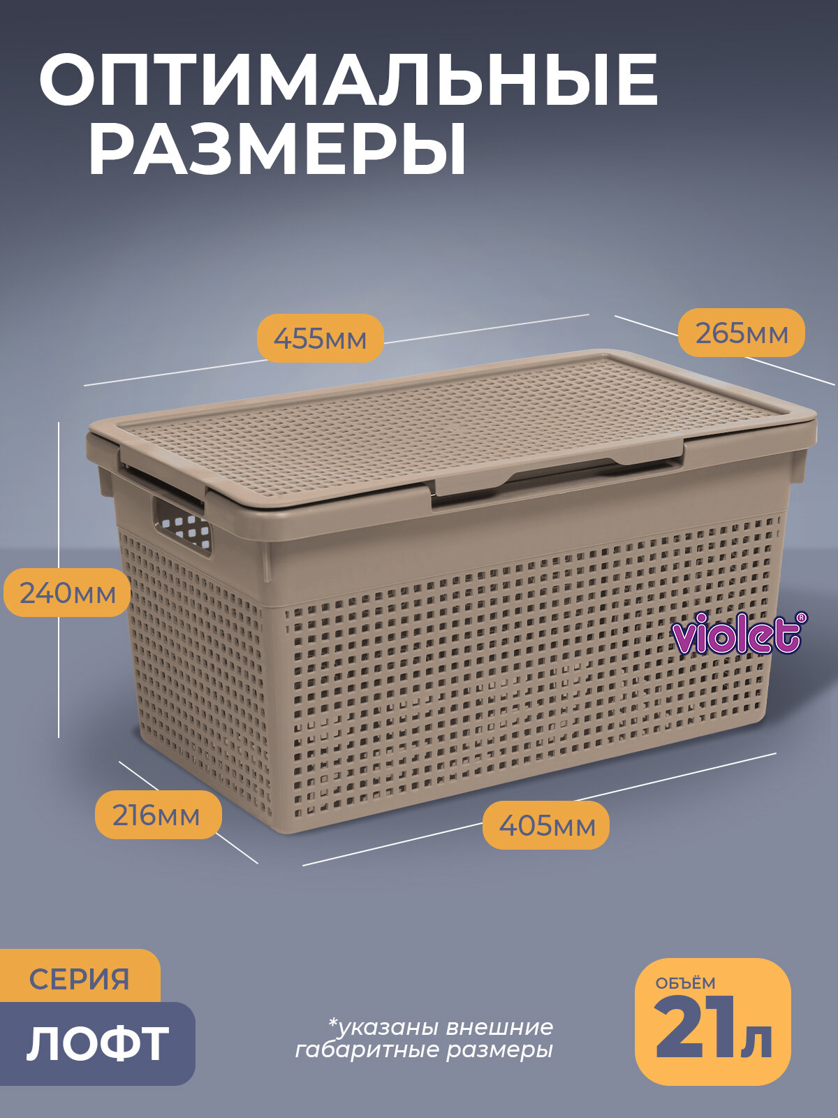 Новинка в стиле Лофт - узкая компактная корзина с крышкой объемом 21 литр для хранения вещей. Небольшая, но при этом достаточно вместительная корзинка выполнена из прочного экологичного пластика, не содержащего бисфенол А. Небольшие габариты контейнера позволят поставить ее в узком месте или ограниченном пространстве ванной комнаты, а также использовать в шкафу в гардеробной, детской комнате, гостиной, спальне, кухне или коридоре. В пластиковом ящике с крышкой можно хранить самые разные вещи: от грязного белья и детских игрушек, до чистых полотенец и бытовой химии. Органайзер не имеет острых углов, а стенки и крышка корзины имеют перфорацию, что обеспечивает хорошую вентиляцию содержимого контейнера. Главное достоинство бельевой корзины - два варианта установки крышки: по узкой или широкой стороне, ее можно переставлять как Вам будет удобнее, в зависимости от месторасположения и открывать короб либо с торцевой, либо с фронтальной стороны. Размеры ящика и устойчивая крышка позволяют поставить несколько корзин одну на другую, или на корзину для белья объемом 50л. Используя несколько корзин, можно организовать систему хранения вещей в шкафу или систему сортировки белья в стирку для семьи, когда белое белье складывается в один контейнер, а цветное - в другой, что заметно облегчит и ускорит сам процесс стирки. Размер узкой корзины 21л с крышкой - 455х265х240мм.