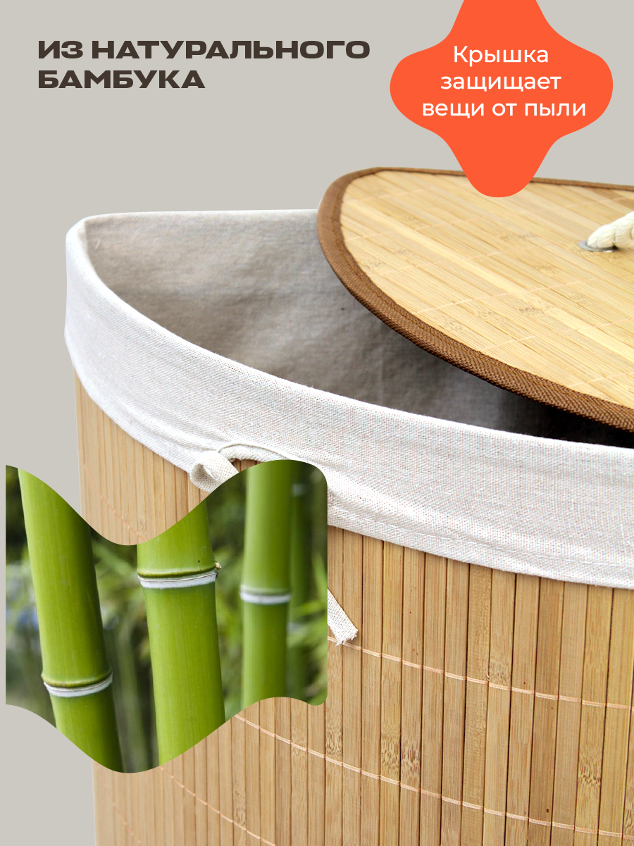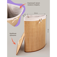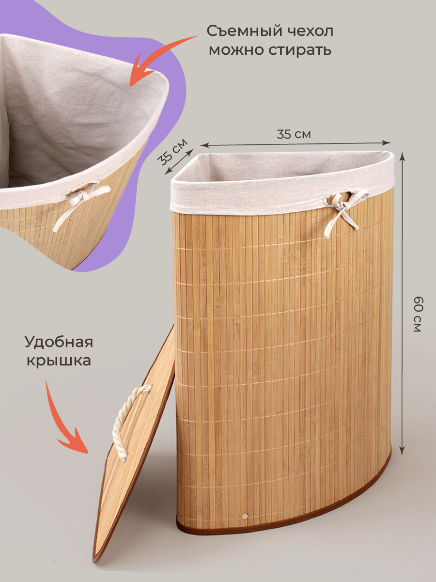 Корзина для белья плетеная в ванную с крышкой узкая, для хранения, угловая бамбуковая. Бельевая корзина для стирки грязных вещей с крышкой пригодится в каждом домохозяйстве! Корзину с крышкой можно применять в качестве органайзера в любой комнате, от прихожей до детской. Ящик для белья изготовлена из экологичного бамбука - благодаря жёсткому каркасу короба она очень легка и надёжна, а помимо этого - контейнер для грязного белья можно разобрать, если это необходимо и очень удобно разместить под раковину. Бельё будет находиться в специальном мешке, который надевается на корзину для хранения, а удобная крышка поможет быть уверенным, кто к вещам не попадёт ничего лишнего. Объем бака для одежды 73 литров. Прочная корзина с ручкой может использоваться не только для уборки дома, но и как игрушечный ящик или даже детская корзинка. Декоративная и стильная, эта корзина будет отлично смотреться в любом интерьере вашего дома. Складная конструкция делает ее удобной в использовании - вы можете легко сложить ее после окончания стирки.