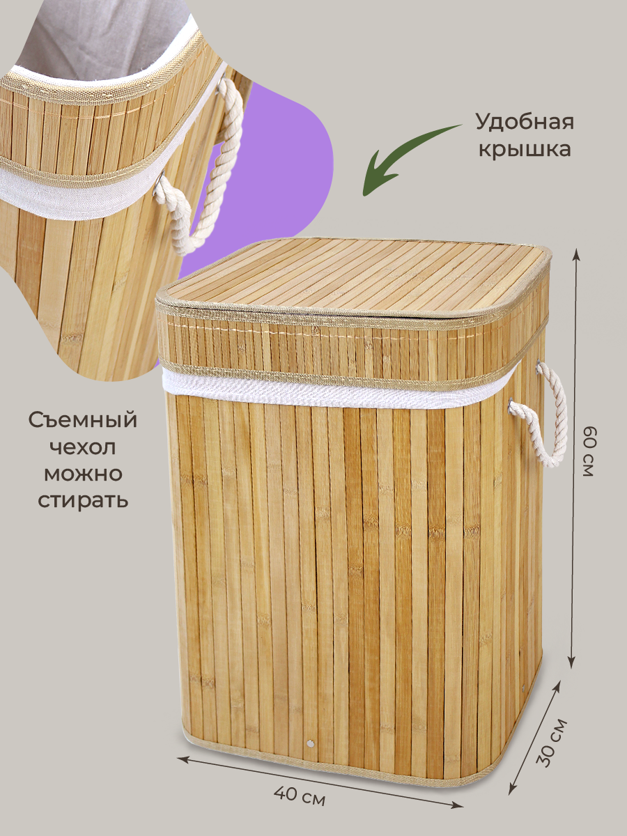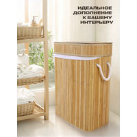Корзина для белья с крышкой предназначена для хранения одежды, хозяйственных полотенец, носков и других принадлежностей для детей и взрослых. Универсальный контейнер прямоугольной формы, что позволяют использовать его в узком пространстве, в том числе, около стиральной машины, ванны или на кухне. Бельевая корзинка подходит для квартир, дома, дачи, кафе, гостиниц. В органайзере можно хранить одеяла, подушки. Идеально заменит сумку, ящик, короб (коробку), мешок и любую другую емкость. Органайзер имеет хлопковую ткань, что обеспечивает хорошую вентиляцию. Корзина безопасна, не имеет острых углов и изготовлена из экологичного материала - бамбук. Плетеная корзина с ручкой станет прекрасным дополнением интерьера и отличным функциональным решением для хранения. При изготовлении используются только натуральные материалы. Бамбуковое плетение пропускает воздух и защищает белье от сырости. Она ривносит в ванную комнату дополнительный комфорт. Поверхность складной детской коризночки для грязного белья обработана водоотталкивающим и антибактериальным покрытием, поэтому большую. Высокое качество и стильный вид гармонично сочетаются и создают уют и теплое настроение. Бак ротанг легкий и прочный, корзиночка для стирки быстро собирается и разбирается