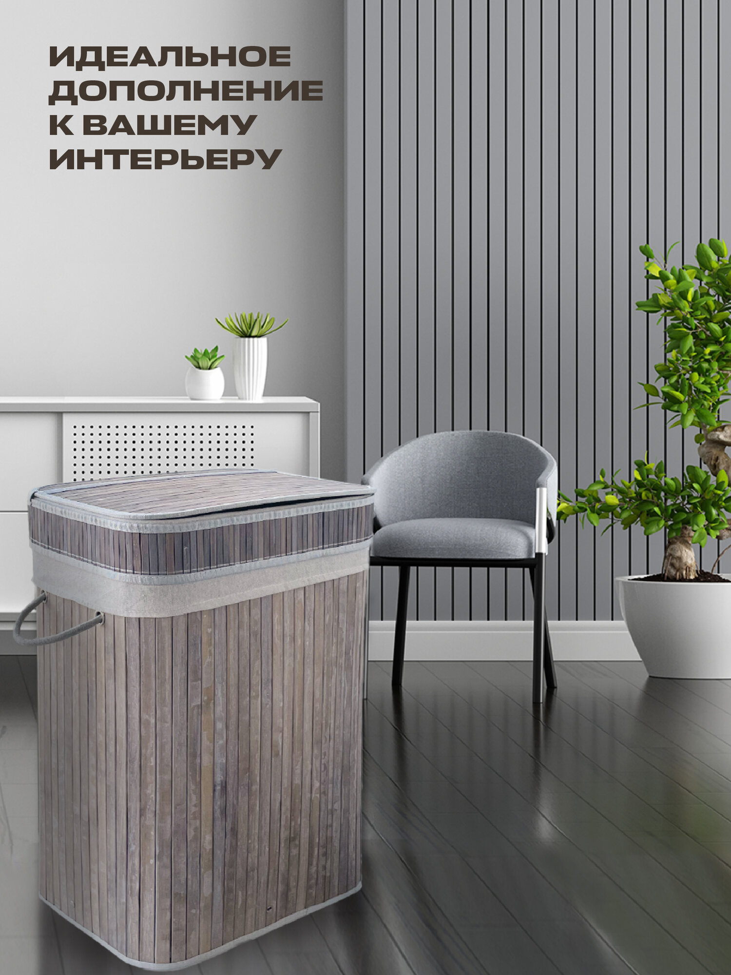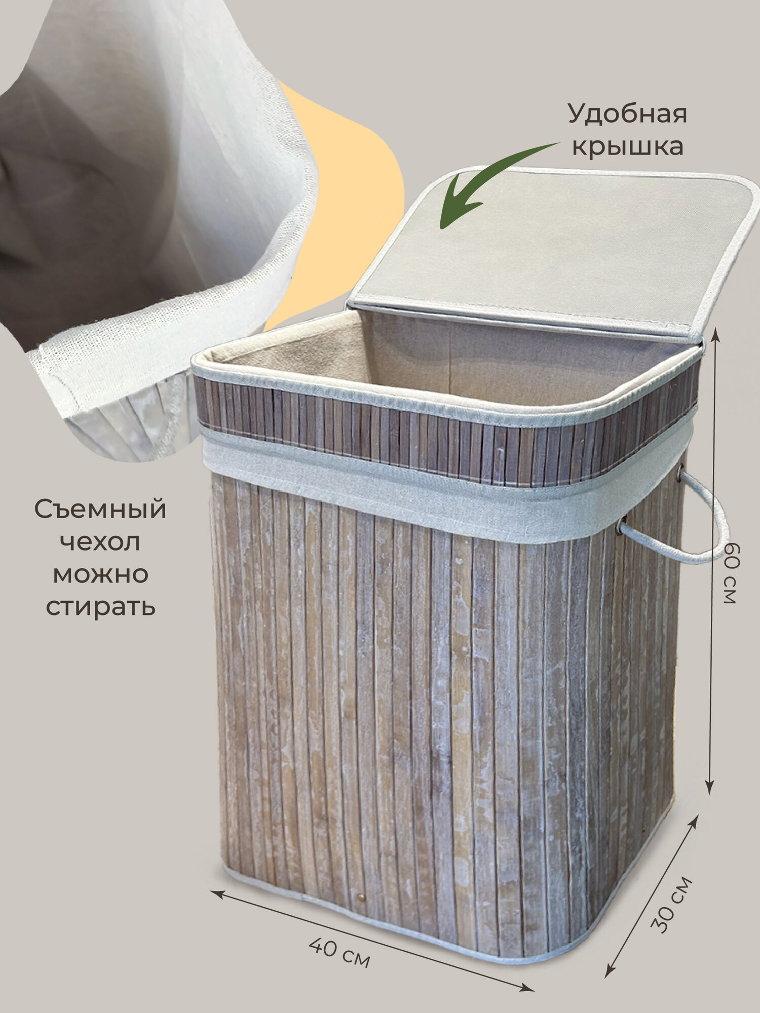 Корзина для белья с крышкой предназначена для хранения одежды, хозяйственных полотенец, носков и других принадлежностей для детей и взрослых. Универсальный контейнер прямоугольной формы, что позволяют использовать его в узком пространстве, в том числе, около стиральной машины, ванны или на кухне. Бельевая корзинка подходит для квартир, дома, дачи, кафе, гостиниц. В органайзере можно хранить одеяла, подушки. Идеально заменит сумку, ящик, короб (коробку), мешок и любую другую емкость. Органайзер имеет хлопковую ткань, что обеспечивает хорошую вентиляцию. Корзина безопасна, не имеет острых углов и изготовлена из экологичного материала - бамбук. Плетеная корзина с ручкой станет прекрасным дополнением интерьера и отличным функциональным решением для хранения. При изготовлении используются только натуральные материалы. Бамбуковое плетение пропускает воздух и защищает белье от сырости. Она ривносит в ванную комнату дополнительный комфорт. Поверхность складной детской коризночки для грязного белья обработана водоотталкивающим и антибактериальным покрытием, поэтому большую. Высокое качество и стильный вид гармонично сочетаются и создают уют и теплое настроение. Бак ротанг легкий и прочный, корзиночка для стирки быстро собирается и разбирается