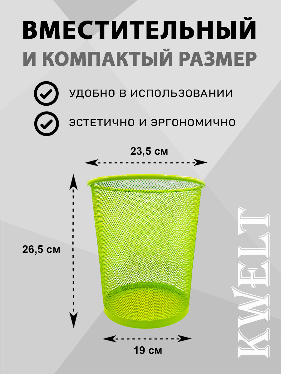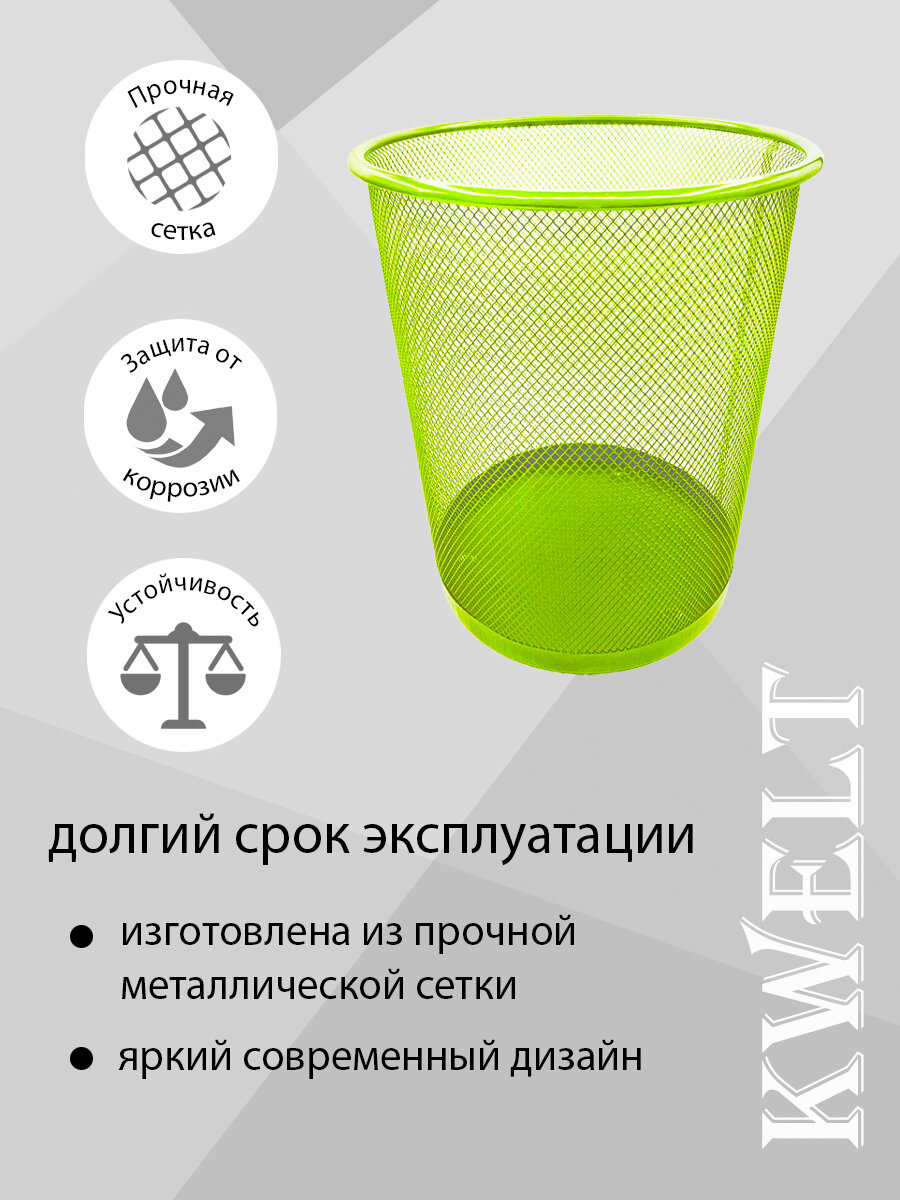 Прочная и надежная сетчатая корзина KWELT идеально подходит для использования в офисах, школах, различных учреждениях. Сетка имеет хорошую упругость, что не позволит объёмному мусору деформировать объём корзины. Компактные размеры позволяют использовать её без ущерба к полезному объему помещения. Изготовлена из металлической сетки, имеет перфорацию. Корпус расширяется к верху: диаметр основания составляет 21 см, диаметр верхней части - 29,5 см, вес: 0.6 кг. Цвет: салатовый. Объем: 8 л. Легкость и компактность корзины позволяет перемещать её с одного места на другое. Корзина удобно помещается под рабочим столом. Стальная сетчатая корзина KWELT с современным дизайном найдёт своё место под любым столом и поможет сохранить рабочее место в чистоте и порядке!