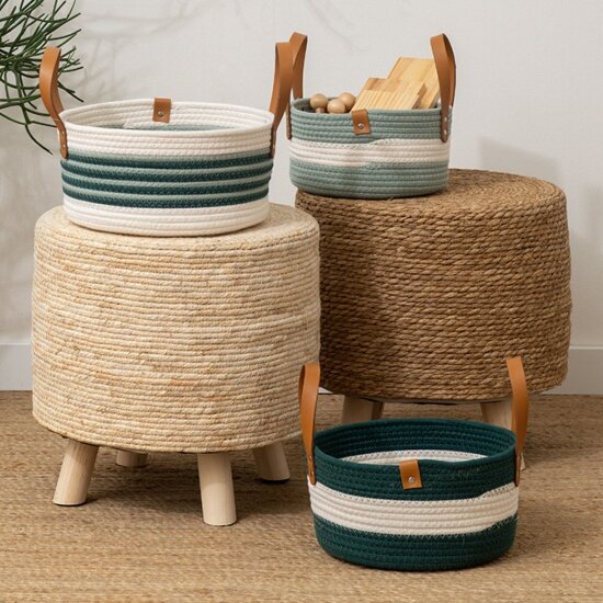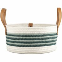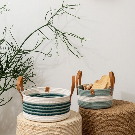 Корзина Helly – прекрасный вариант для хранения различных предметов. Благодаря стильному дизайну такой контейнер отлично вписывается в современный интерьер гостиной, спальни или прихожей. Изделие выполнено из хлопковой нити с добавлением полиэстера, что гарантирует ему прочность, устойчивость к истиранию и привлекательный вид на протяжении всего срока службы. Изюминку корзине придают плетеный корпус и ручки из полиуретана, которые также обеспечивают удобную переноску.