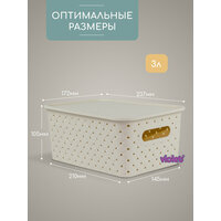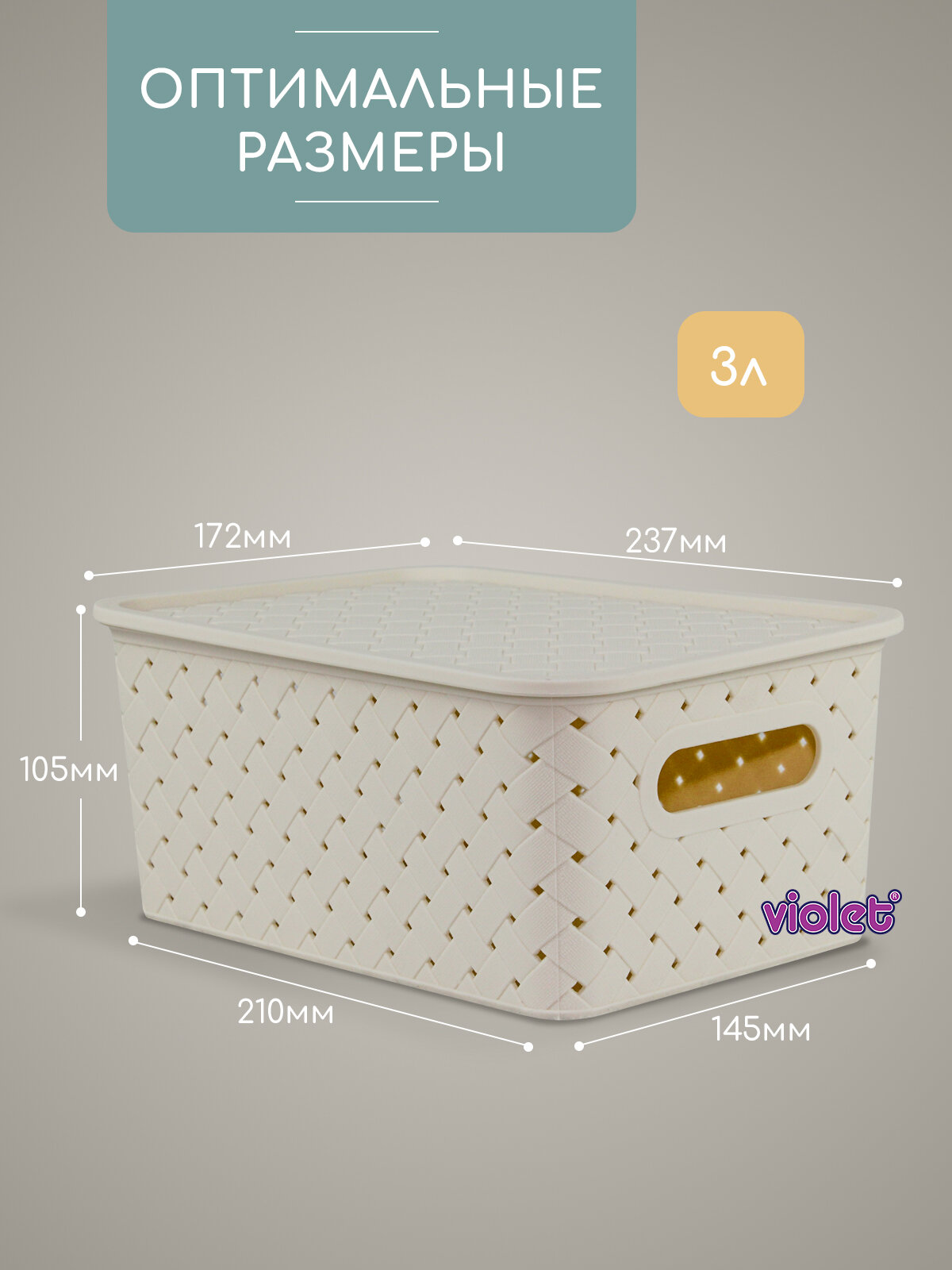 Корзина для хранения «Береста» – незаменимый помощник в каждом доме. Многофункциональный органайзер можно использовать для хранения канцелярских принадлежностей, пищевых продуктов, хозяйственных товаров, средств личной гигиены, детских игрушек, а также косметики и любых аксессуаров. Корзинка станет верным помощником на кухне, в ванной, прихожей, спальне, детской комнате, на балконе, в гараже, кладовке и любых других помещениях. Ее можно поставить в шкаф или на тумбочку. Благодаря эргономичным ручкам на стенках короба и его лёгкому весу, вы сможете без труда переносить его в любое место. Перфорация на крышке и стенках ящика способствует циркуляции воздуха, благодаря чему в нём не скапливается влага, а находящиеся в нем вещи вентилируются. Контейнер выполнен из прочного пластика, предназначенного для пищевых продуктов. Коробки отличаются компактной формой, вместительностью и удобством. Пустые органайзеры удобно хранить – они вставляются друг в друга, экономя место. Если надеть крышку, органайзеры можно поставить один на другой. Стильные корзинки бренда Violet впишутся в любой интерьер и станут гармоничной частью дизайна. Размер – 235 x 173 x 105 мм.