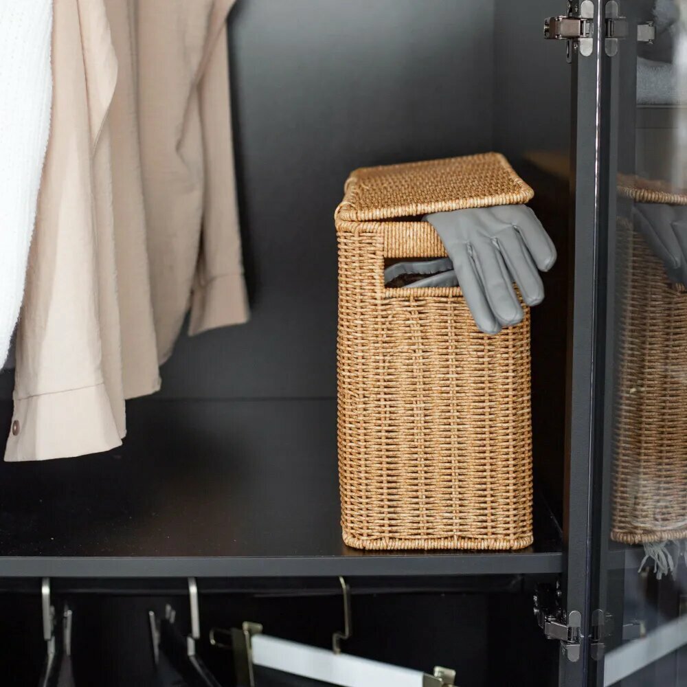 Узкая корзина плетеная с крышкой и ручками размер: 38х27х15см. Корзина из полиротанга (пластик) имеет прочный металлический каркас и большой объем для хранения. Полиротанг или искусственный ротанг отличается от натуральной ротанговой лозы экологичностью, так как исключает вырубку растения. Корзина отлично встанет в гардеробную. Короб с крышкой для хранения идеален для использования в ванной комнате для хранения белья, полотенец, бытовой химии, так как материал устойчив к образованию плесени, а также не рассыхается и не боится воды, легко моется влажной тряпкой или губкой. Плетеная корзина в спальне или гостиной станет местом для хранения белья и книг. Она легко переносит перепады температур и ультрафиолетовое излучение, поэтому подойдет для хранения на балконе, лоджии, веранде. Приятная на ощупь текстура, вместительность и безопасный вид плетения подходит для детской комнаты, как короб или корзина для игрушек. В гардеробной корзина для белья плетеная станет местом для мелких аксессуаров - перчатки, шарфы, шапки. Надоел визуальный шум в пространстве, беспорядок в вещах - стильная плетеная корзинка, коробка для хранения справиться с этой задачей и украсит ваш интерьер. Короб для стеллажа станет оригинальным и приятным подарком на 8 марта день матери или день рождения для мамы сестры жены или как подарок бабушке.