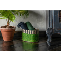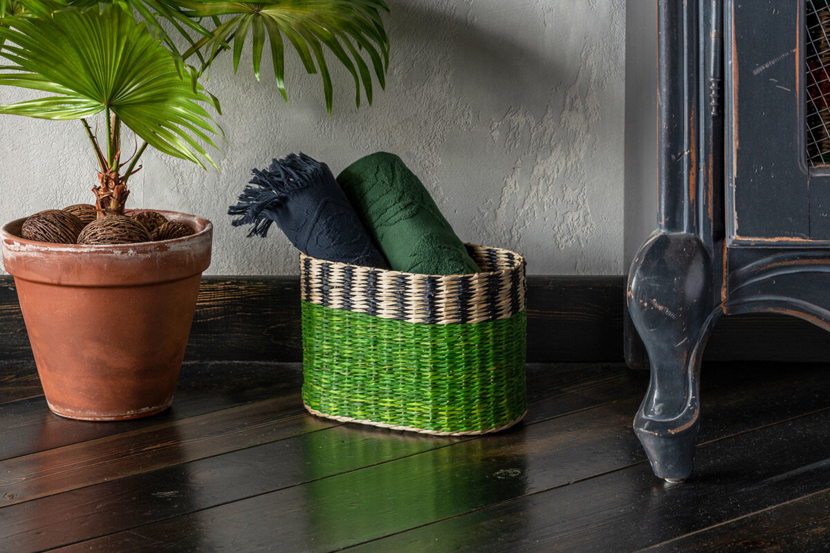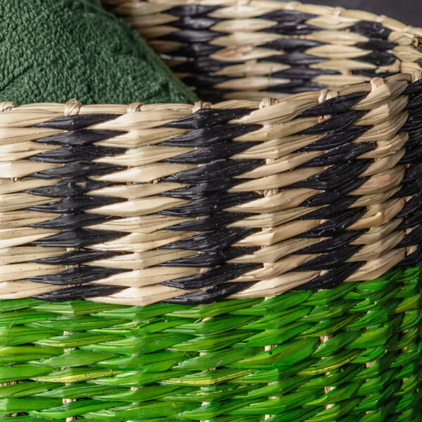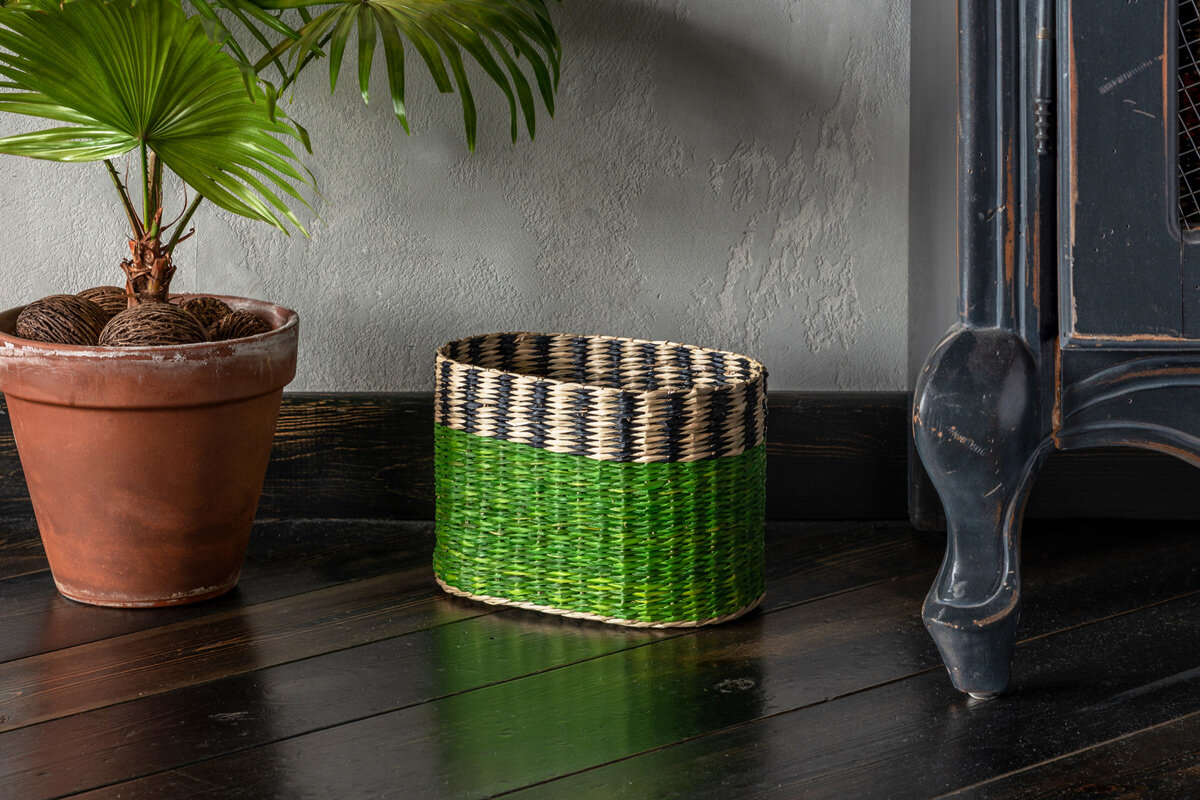Плетеная корзина TamTam ручной работы из морских водорослей — экологичного материала. Геометричный рисунок сформирован с помощью вплетения цветных волокон зеленого и черного цвета. Краска с добавлением антибактериальной пропитки. Вместимость — 7,2 л. Корзина является частью коллекции TamTam, которая представлена в Likemyhome в полном составе. Наполните интерьер деталями африканского континента вместе с предметами серии. Хранить корзины при стандартном уровне влажности от 30% до 60%. Протирать от пыли мягкой тканью. Можно использовать пылесос. Чистить локально вручную с помощью мокрой губки. Не стирать. Не использовать абразивные чистящие средства. Не сушить под прямыми солнечными лучами и рядом с батареями. Ручная работа 100% — морские водоросли Краска с добавлением антибактериальной пропитки Рисунок сформирован с помощью вплетения цветных волокон Корзина хорошо держит форму благодаря плетеному каркасу Воздухопроницаемость Гарантия: 1 год