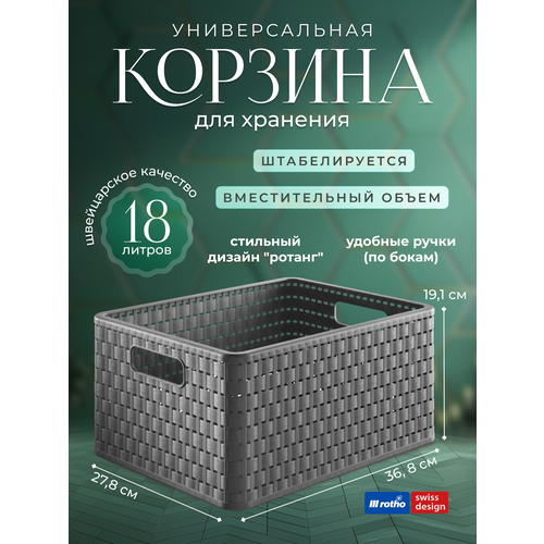 Основные характеристики: - Объем: 18 литров - Форма: прямоугольная - Размеры: длина 36,8 см, ширина 27,8 см, высота 19,1 см - Цвет: темно-серый - Количество отделений: 1 - Материал: полипропилен - Назначение: для хранения белья, одежды, аксессуаров и мелочей