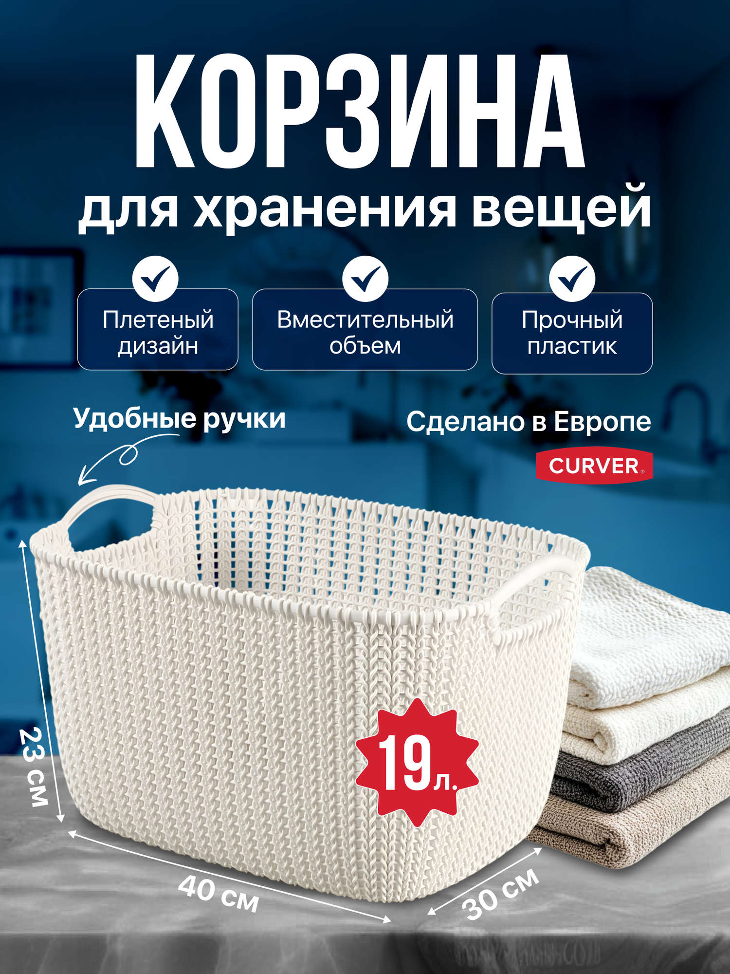 Корзина для хранения вещей, с ручками плетеная Curver KNIT 19 литров 40*30*23 см, 3670 белый: сравнение цен, характеристики, фото, актуальное наличие и цены.
