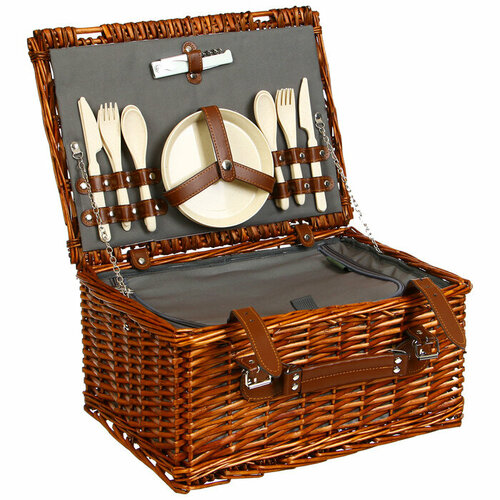 Корзина-холодильник для пикника с посудой — компактный и функциональный набор для отдыха на природе. Изделие плотно фиксируется специальными ремешками, есть встроенная термосумка для продуктов. Корзина выполнена из натуральной лозы и имеет древесную текстуру.