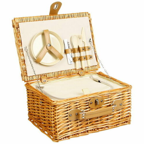 Артикул: 2174-722. Размеры: 20 x 27 x 38 см, Материал: Лоза, Пластик, Вес: 1240 гр, Размер упаковки: 27 x 20 x 38 см, Цвет: Бежевый, Вид: Набор для кемпинга, Набор: Да, Рисунок: Нет, Количество персон: 2, В наборе, шт: 13, Назначение: Для приёма пищи, Вид упаковки: Без упаковки, Комплектация: Столовая посуда. Корзина-холодильник для пикника с посудой компактный и функциональный набор для отдыха на природе. Изделие плотно фиксируется специальными ремешками, есть встроенная термосумка для продуктов. Корзина выполнена из натуральной лозы и имеет древесную текстуру. ОсобенностиВнешняя часть из натуральной лозы. Комплектация рассчитана на две персоны. Универсальный набор многоразовой посуды: ножи, вилки, ложки, тарелки, стаканы, штопор и салфетка. Посуда и приборы сделаны из лёгких материалов, что обеспечивает небольшой вес набора. КомплектацияКорзина-холодильник. Вилка, 2 шт. Ложка, 2 шт. Нож, 2 шт. Тарелка, 2 шт. Стакан, 2 шт. Штопор, Салфетка. ПараметрыРазмер корзины: 38 x 27 x 20 смВнешний материал корзины: натуральная лоза. Внутренний материал корзины: 40 % хлопок, 60 % полиэстер. Материал посуды: полипропилен, пшеничная солома. Объём стакана: 350 млДиаметр тарелки: 15 см.
