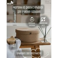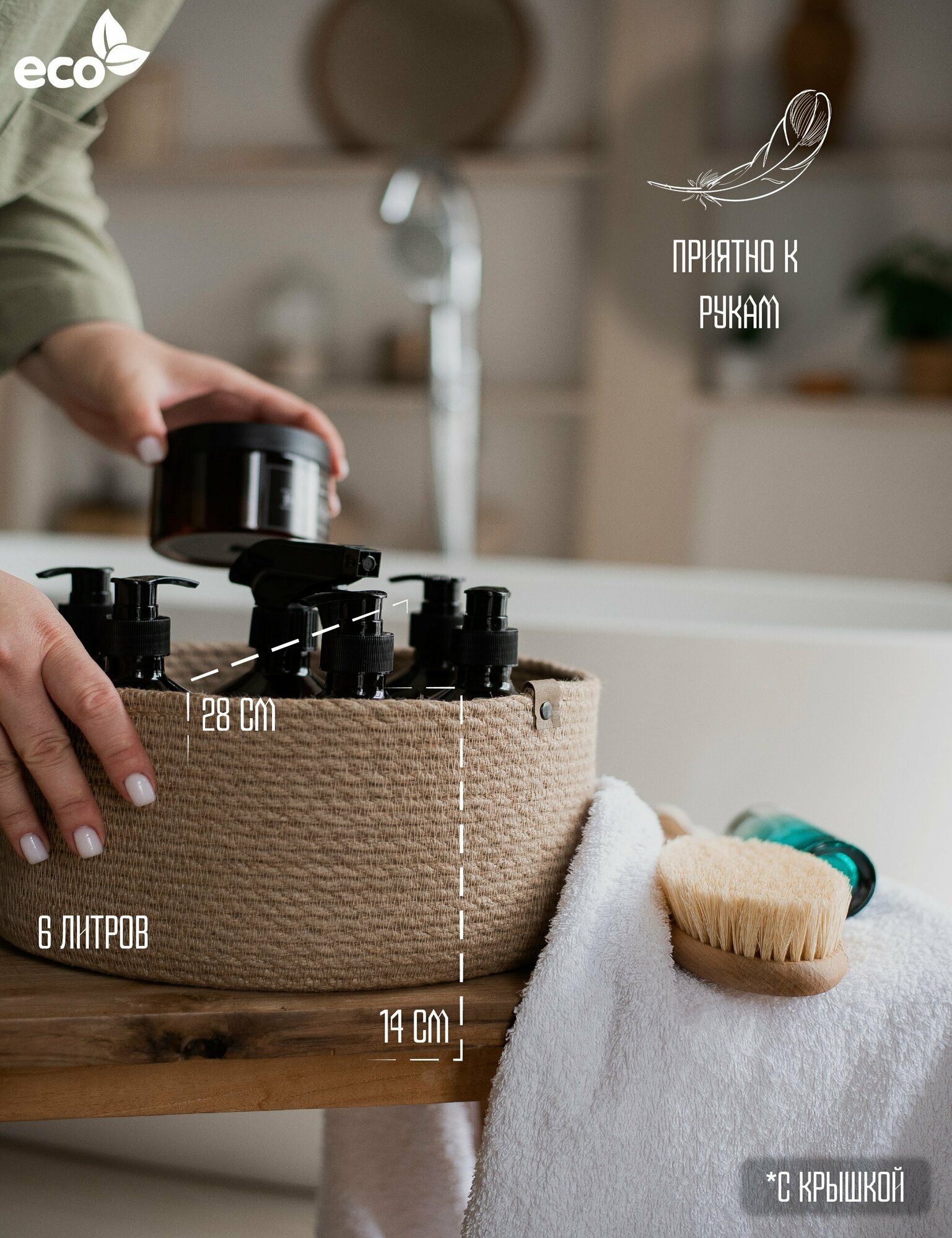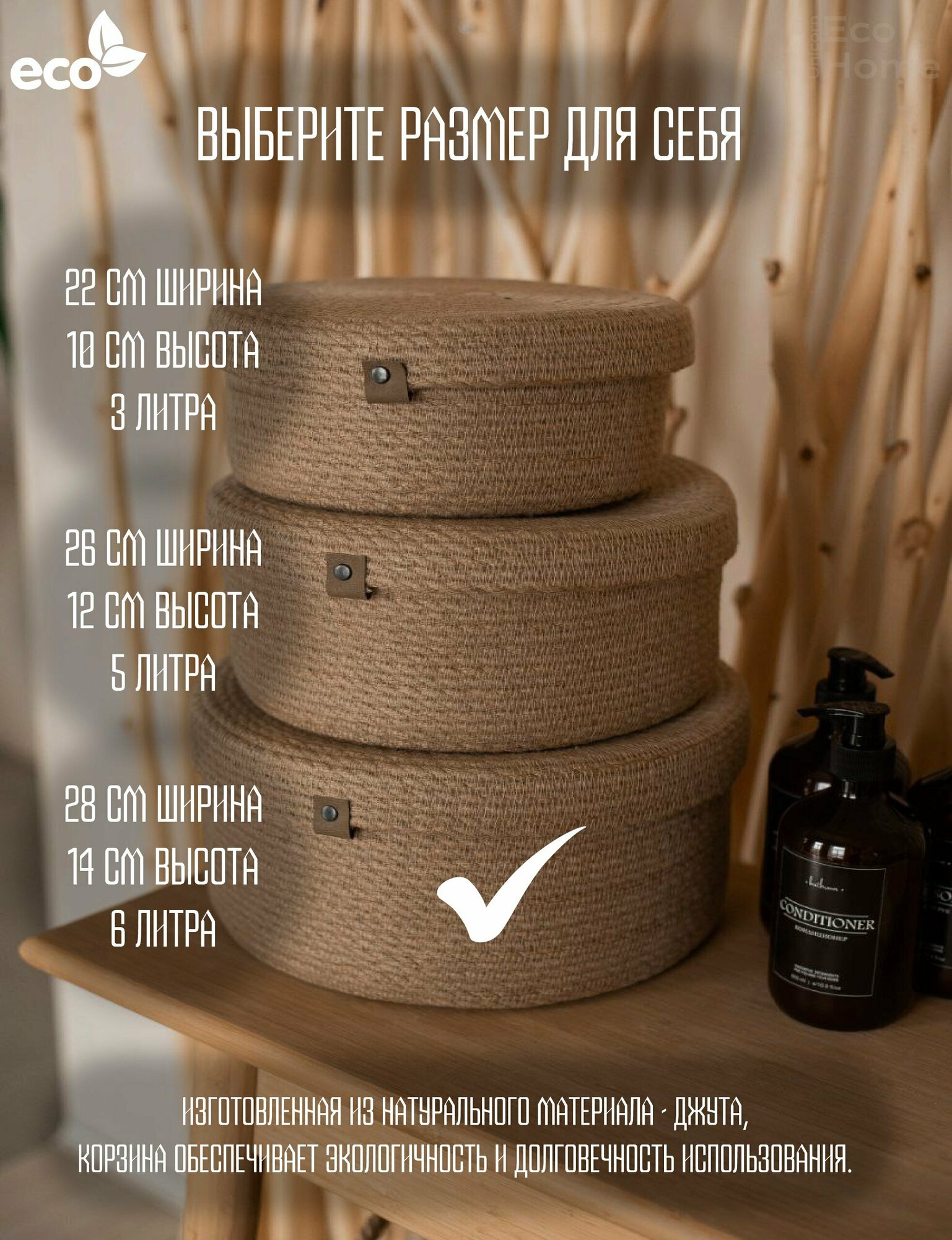 Корзина: - Высота: 14 см. - Ширина: 28 см. - Длина: 28 см. - Объем: 6 л. - Материал: джут. - Форма: круглая. - Назначение: для хранения. - Особенности: с крышкой.