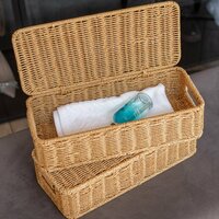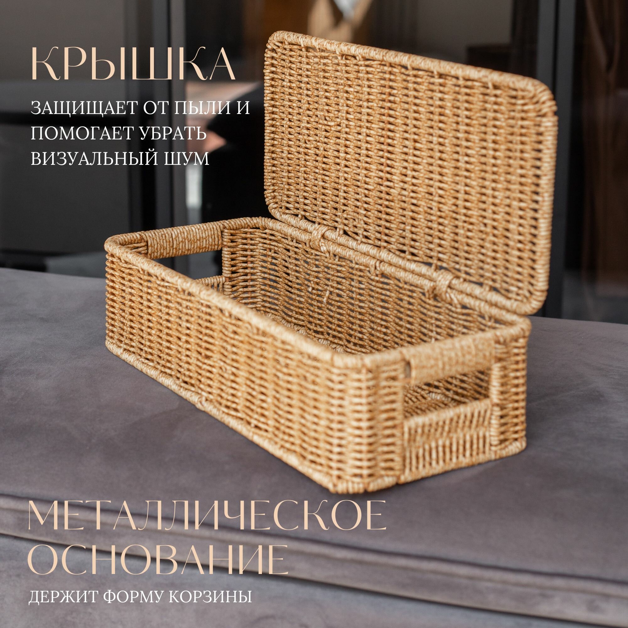 Небольшая корзина плетеная с крышкой - это удобный и практичный предмет для хранения вещей. Размер корзины: 35,5х15,5х9см.