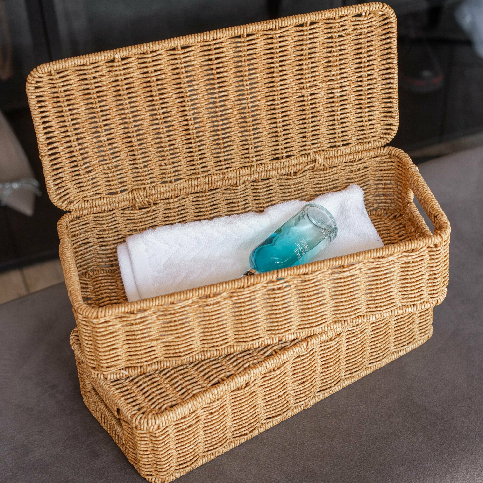 Корзина с крышкой - отличный выбор для тех, кто ценит комфорт и удобство в использовании. Она украсит любое помещение в Вашем доме и квартире, станет незаменимым помощником в хранении вещей и организации порядка в спальне, гостиной, детской, прихожей. Эта корзина для хранения отлично подойдет для использования в гардеробе и стеллажах. Благодаря своей форме, в ней можно хранить перчатки, носочки, маленькие полотенчики.