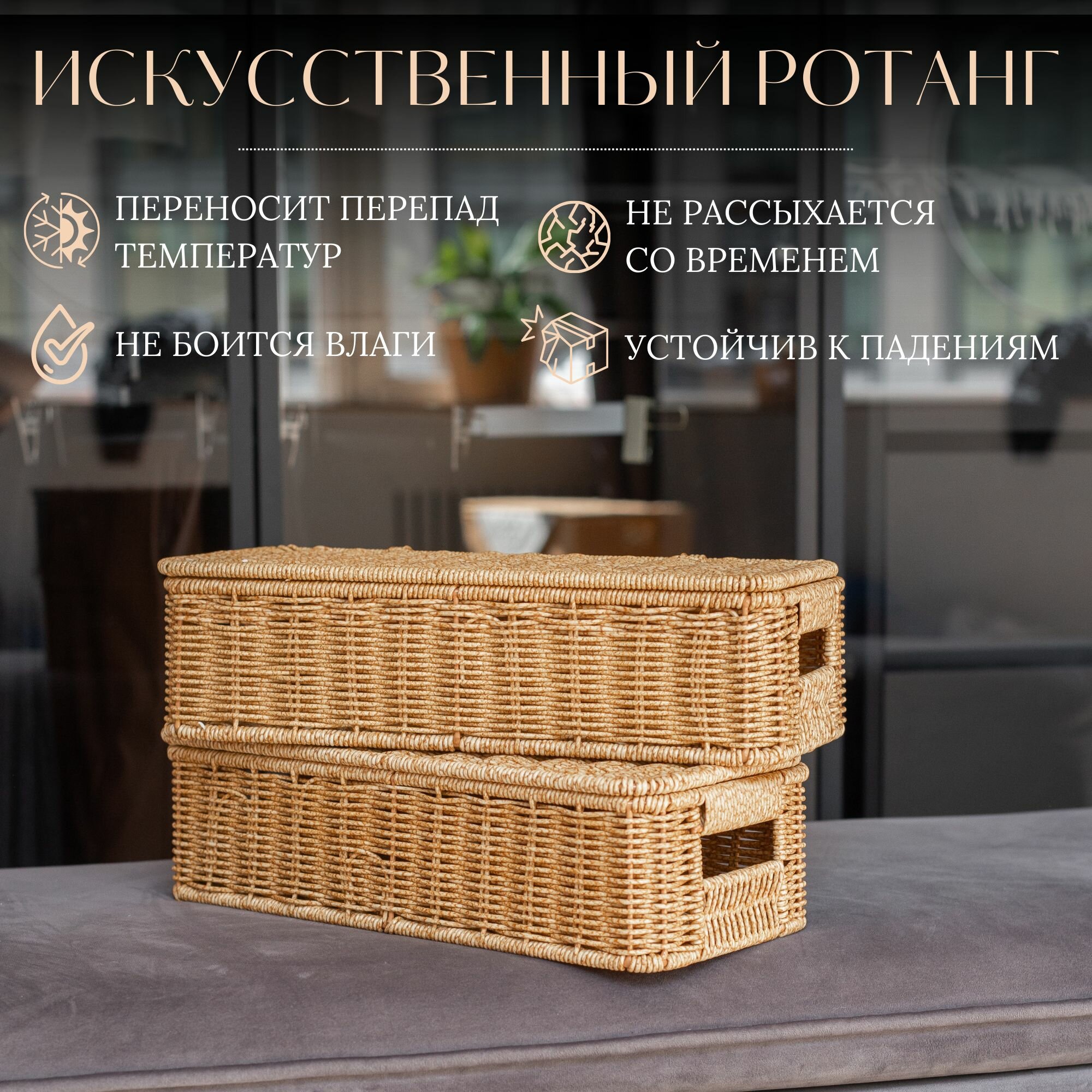 Особой популярностью плетеные корзины Jimmy`s Dome пользуются на кухне, прихожей, в ванной комнате и на балконе. В отличии от натурального ротанга, наши изделия, сделанные из полиротанга (пластиковая лента), не рассыхаются от перепада температур, не портятся от влаги и не подвержены поражению грибком и другой микрофлорой. Приятная на ощупь текстура, вместительность и безопасный вид. Плетеная шкатулка подходит для детской комнаты как короб для хранения канцелярии и мелочей, как корзина для игрушек небольшого размера, а так же для хранения на стол рукодельнице. Такая корзина в спальне или гостиной станет местом для хранения аксессуаров и мелочей. В ванной комнате как корзина для хранения косметики. На кухне плетеная корзина с крышкой станет местом для специй, конфет, приборов.