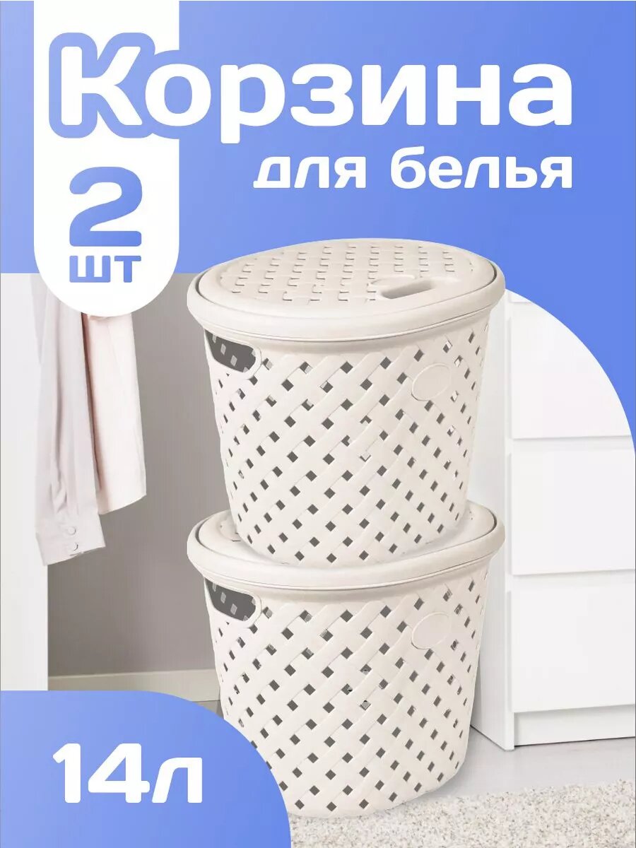 Купить Корзина Plast Team «Rattan» для белья в ванную с крышкой плетеная пластик 14 л 2 шт, (молочный туман) 4088 с доставкой по всей России.