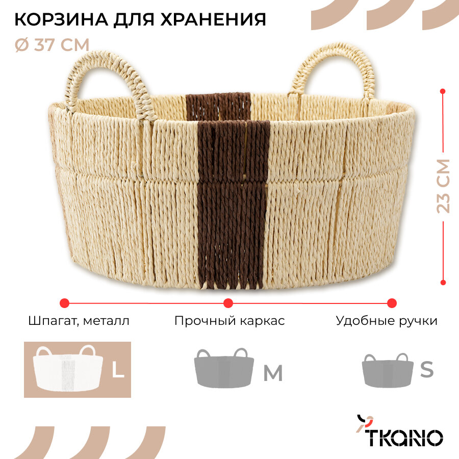 - Изделие имеет железный каркас, благодаря чему обладает повышенной прочностью, хорошей устойчивостью, долго служит и не боится деформации. - Плетение из шпагата делает дизайн привлекательным и обеспечивает оптимальную вентиляцию, предотвращая скопление влаги внутри. - За счет нейтральной цветовой гаммы корзина без труда интегрируется в различные интерьерные решения, а удобные ручки облегчают ее перемещение. - Корзину можно использовать для хранения предметов в любой из комнат и как самостоятельный элемент декора. - Аксессуары в этническом стиле позволяют создать уникальный интерьер, отражающий личные предпочтения и вкусы своего владельца.