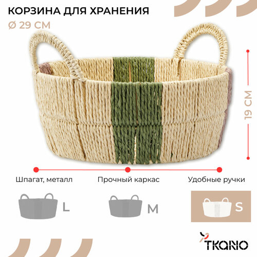 - Изделие имеет железный каркас, благодаря чему обладает повышенной прочностью, хорошей устойчивостью, долго служит и не боится деформации. - Плетение из шпагата делает дизайн привлекательным и обеспечивает оптимальную вентиляцию, предотвращая скопление влаги внутри. - За счет нейтральной цветовой гаммы корзина без труда интегрируется в различные интерьерные решения, а удобные ручки облегчают ее перемещение. - Корзину можно использовать для хранения предметов в любой из комнат и как самостоятельный элемент декора. - Аксессуары в этническом стиле позволяют создать уникальный интерьер, отражающий личные предпочтения и вкусы своего владельца.