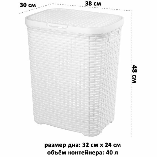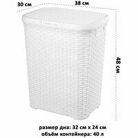 Прямоугольная форма корзины с размерами 38х30х48 см и объемом 40 литров позволяет вместить большое количество белья, экономя пространство в ванной комнате или в любом другом помещении.