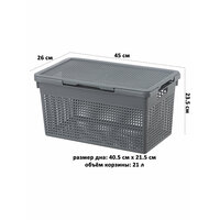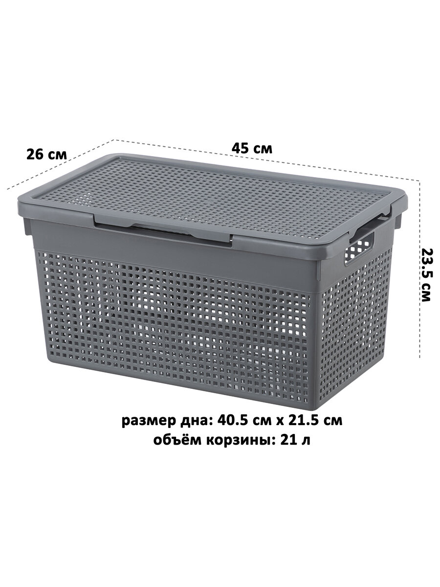 Объем корзины составляет 21 литр, что позволяет разместить в ней большое количество вещей. Размер дна корзины составляет 40,5*21,5 см, что обеспечивает достаточное пространство для хранения различных предметов.