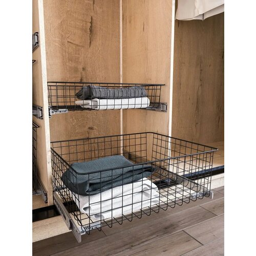 Сетчатая корзина станет отличным вариантом для внутреннего наполнения шкафа-купе, гардеробной, гаража, кладовой, детской комнаты и системы хранения. Благодаря широкому размерному ряду стальная корзинка может быть встроена в любой шкаф, нишу, коридор или прихожую. Корзина отличается высоким функционалом, ее с легкостью можно использовать вместо выдвижной или откидной корзины. В комплекте с корзиной прищепки для крепления к шариковым направляющим (4 шт).
