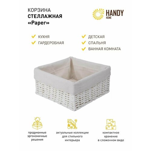 Компактная стеллажная корзина PAPER от Handy Home в актуальном белом цвете, сплетённая из бумажного шпагата, гармонично дополнит интерьер и поможет навести порядок на полках стеллажа или шкафа. Разместите в ней салфетки или кухонные приборы, банные принадлежности, косметику и украшения, аксессуары для творчества, канцелярию или прочие мелочи, которые некуда сложить. В комплекте идёт съёмный тканевый чехол, который легко снимается для стирки. Материал изготовления корзины: бумага, ткань, металлический каркас.
