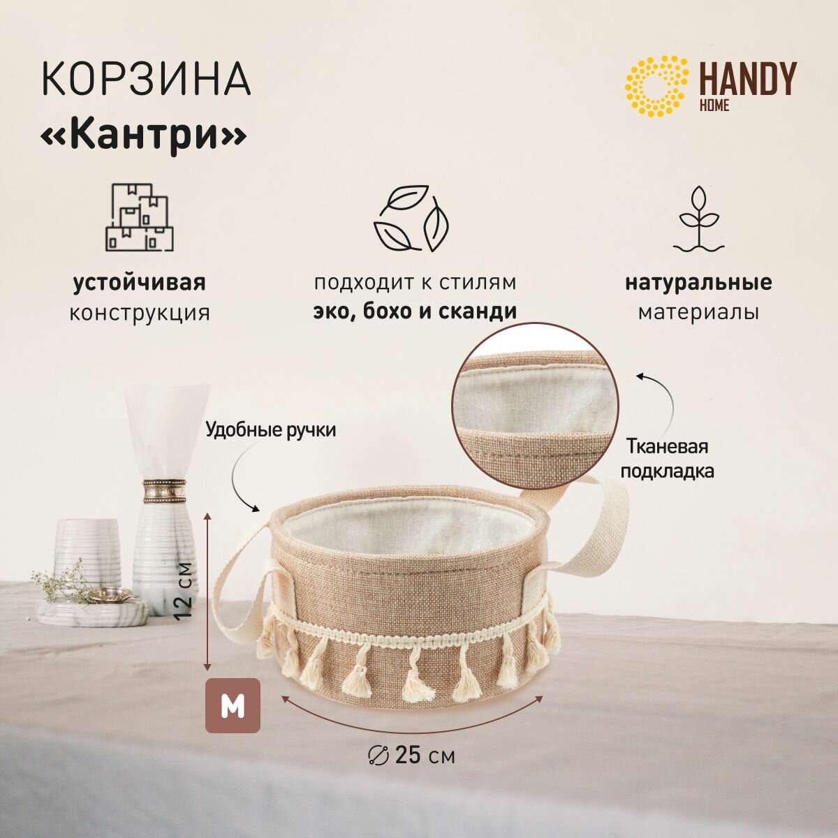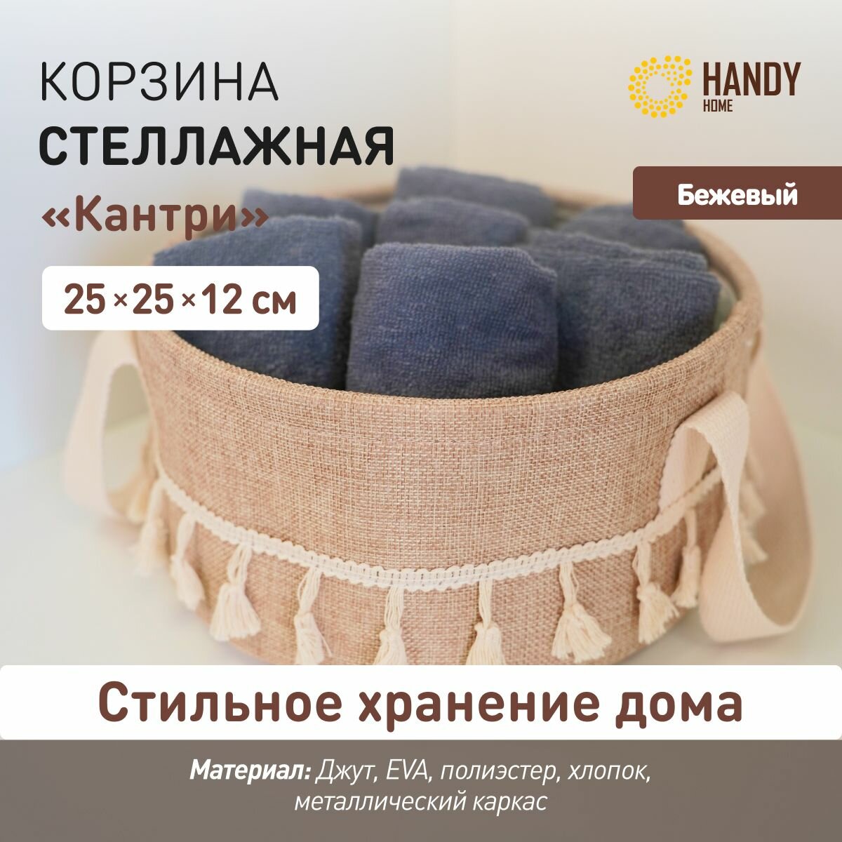Каркас корзины для хранения металлический – она отлично держит форму. Круглые текстильные корзинки устойчивы и не деформируются со временем.
