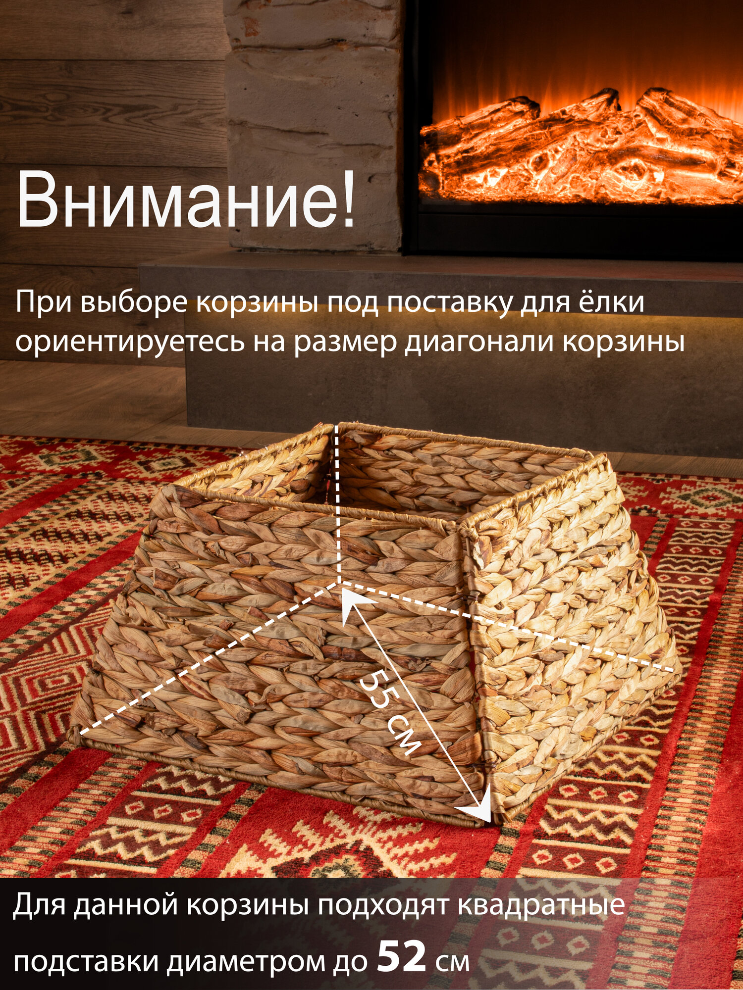Корзина квадратная под елку из натуральных волокон поможет скрыть подставку для елки вплоть до первых веток, придав всей композиции праздничный и завершенный вид. Плетеная корзина юбка диаметром 39 см подойдет для подставок диаметром до 36 см. Размеры: диаметр низа- 39 см, диаметр верха-27 см, высота корзины-23 см. Цвет: бежевый. Юбка для елки сделана из растительных материалов и не взывает аллергии. Установка плетеной корзины без дна не требует дополнительных усилий просто соедините 4 части конструкции между собой. Далее во внутрь корзины поместите подставку с собранными нижними ветками дерева и завершите сборку новогодней елочки. Стильная корзина для декорирования создаст неповторимый образ рождественской ели, который будет радовать вас своей оригинальностью. Ваше нарядное дерево станет настоящей изюминкой на Новый год. Такая корзина для елки также спрячет провода от гирлянд или ведро с водой для живой ели. Рядом с декоративной подставкой можно расположить любые новогодние украшения для дома. Корзина сделана из качественного пластика, ее можно протирать влажной тряпкой от пыли. Плетеная подставка корзина подходит для искусственных елок или живых любой высоты, но перед покупкой проверьте размер подставки вашей елки и подберите подходящий размер корзины среди нашего ассортимента. Чтобы ознакомиться с полной линейкой товаров, нажмите на логотип и перейдите в наш магазин.