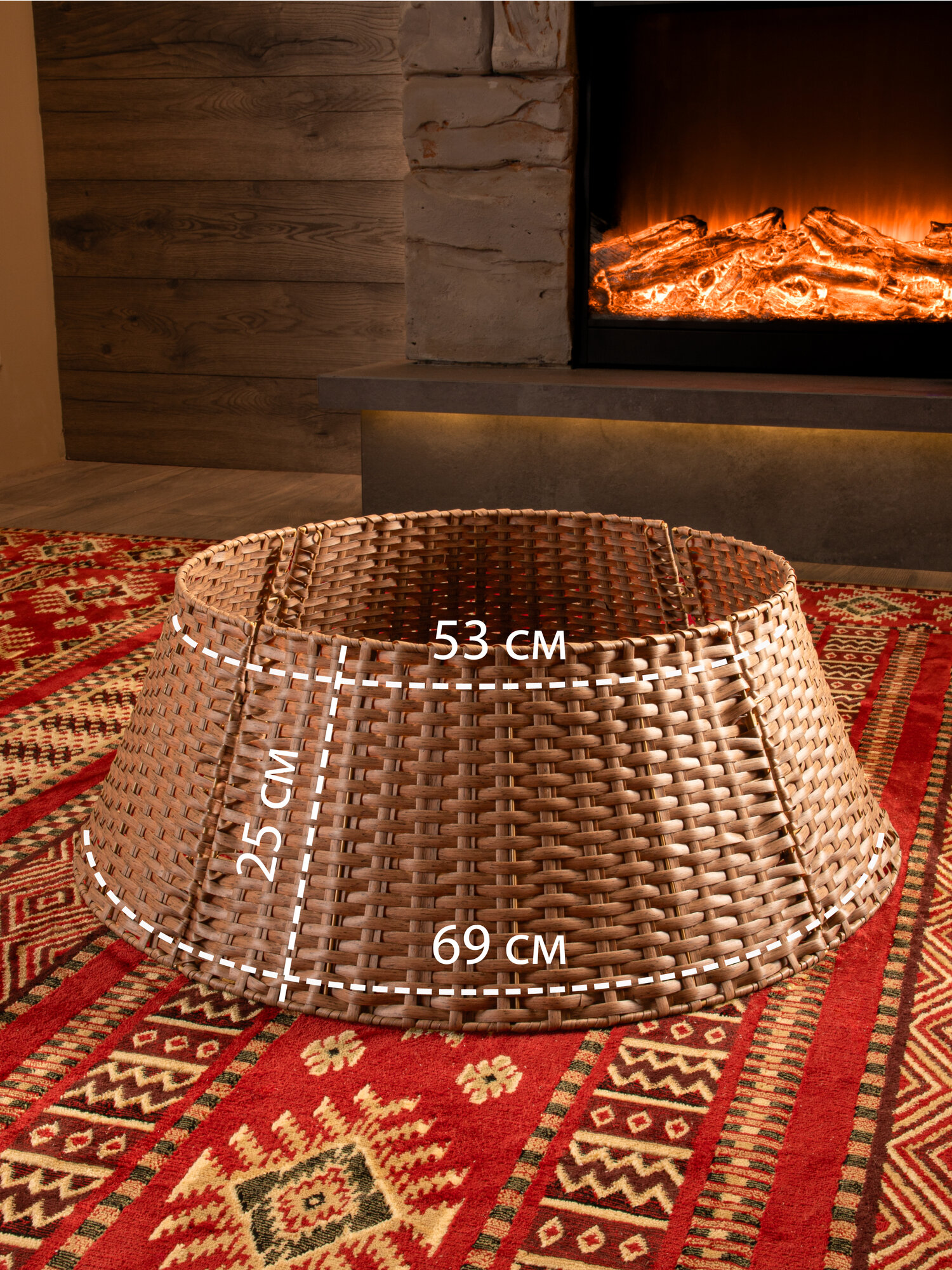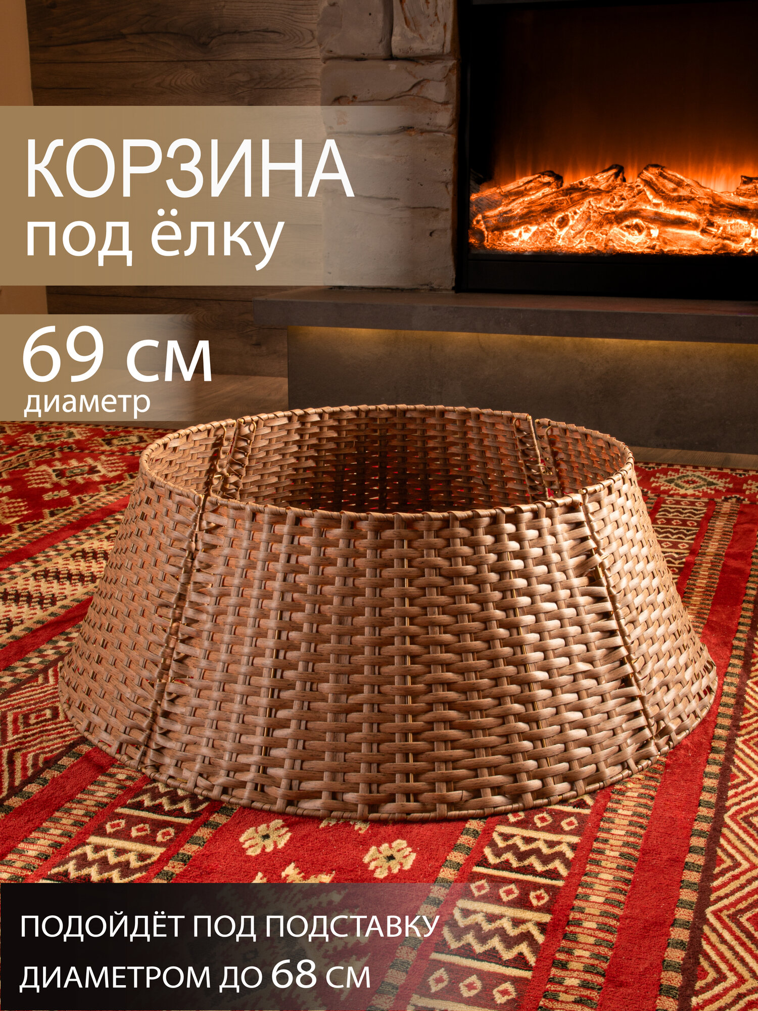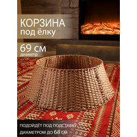 Корзина под елку из искусственного ротанга поможет скрыть подставку для елки вплоть до первых веток, придав всей композиции праздничный и завершенный вид. Плетеная корзина юбка диаметром 69 см подойдет для подставок диаметром до 66 см. Размеры: диаметр низа- 69 см, диаметр верха- 53 см, высота корзины-25 см. Цвет: коричневый. Установка плетеной корзины без дна не требует дополнительных усилий просто соедините 4 части конструкции между собой. Далее во внутрь корзины поместите подставку с собранными нижними ветками дерева и завершите сборку новогодней елочки. Стильная корзина для декорирования создаст неповторимый образ рождественской ели, который будет радовать вас своей оригинальностью. Ваше нарядное дерево станет настоящей изюминкой на Новый год. Такая корзина для елки также спрячет провода от гирлянд или ведро с водой для живой ели. Рядом с декоративной подставкой можно расположить любые новогодние украшения для дома. Корзина сделана из качественного пластика, ее можно протирать влажной тряпкой от пыли. Плетеная подставка корзина подходит для искусственных елок или живых любой высоты, но перед покупкой проверьте размер подставки вашей елки и подберите подходящий размер корзины среди нашего ассортимента. Чтобы ознакомиться с полной линейкой товаров, нажмите на логотип и перейдите в наш магазин.