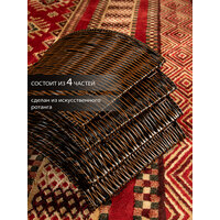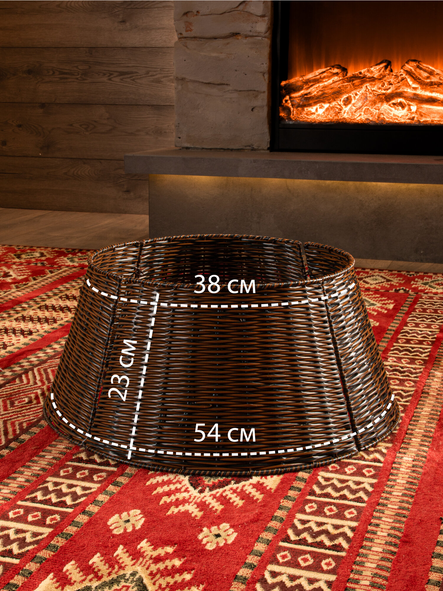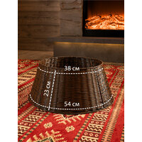 Корзина под елку из искусственного ротанга поможет скрыть подставку для елки вплоть до первых веток, придав всей композиции праздничный и завершенный вид. Плетеная корзина юбка диаметром 54 см подойдет для подставок диаметром до 52 см. Размеры: диаметр низа- 54 см, диаметр верха- 38 см, высота корзины-23 см. Цвет: темно-коричневый. Установка плетеной корзины без дна не требует дополнительных усилий просто соедините 4 части конструкции между собой. Далее во внутрь корзины поместите подставку с собранными нижними ветками дерева и завершите сборку новогодней елочки. Стильная корзина для декорирования создаст неповторимый образ рождественской ели, который будет радовать вас своей оригинальностью. Ваше нарядное дерево станет настоящей изюминкой на Новый год. Такая корзина для елки также спрячет провода от гирлянд или ведро с водой для живой ели. Рядом с декоративной подставкой можно расположить любые новогодние украшения для дома. Корзина сделана из качественного пластика, ее можно протирать влажной тряпкой от пыли. Плетеная подставка корзина подходит для искусственных елок или живых любой высоты, но перед покупкой проверьте размер подставки вашей елки и подберите подходящий размер корзины среди нашего ассортимента. Чтобы ознакомиться с полной линейкой товаров, нажмите на логотип и перейдите в наш магазин.