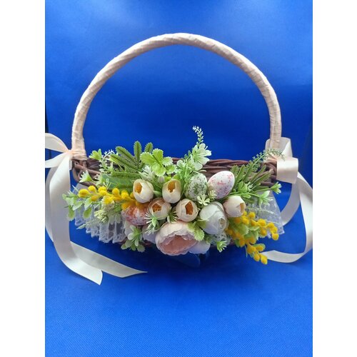 Корзина ручной работы для пасхальных угощений ( яйца , пасха , куличи , конфеты) великолепно будет смотреться как на пасхальном столе, так и для любого декора в интерьере. Корзина эксклюзивной дизайнерской работы декорирована из композиции искусственных цветов, отлично подойдет не только для праздника Пасхи и декора интерьера , но и для хранения различных предметов ( фрукты , конфеты и т. д.) , а так же для подарка для ваших родных и близких людей ! Обращаем ваше внимание , так как это ручная работа , могут быть незначительные отличия !