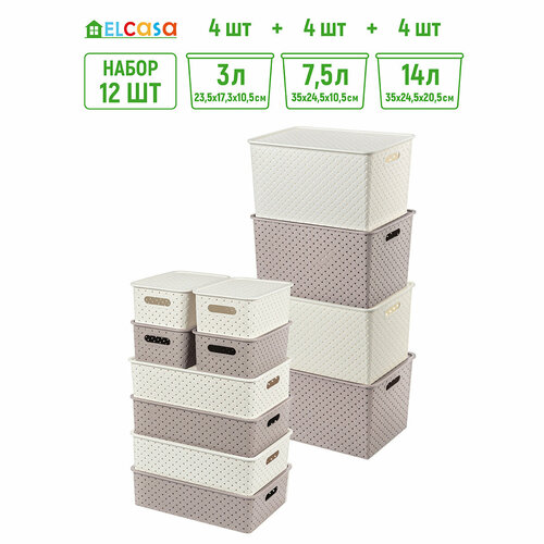 Купить Корзинка / коробка для хранения с крышкой 12шт Береста 3 л (4шт), 7,5 л (4шт), 14 л (4шт) El Casa слоновая кость и мокка, набор с доставкой по всей России.