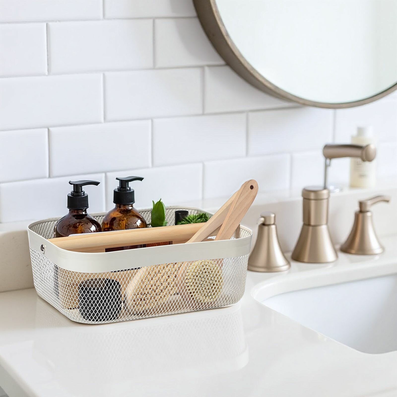 Изготовленная из качественного металла, эта корзинка сочетает в себе прочность и легкость в уходе. Благодаря своей прямоугольной форме и одной секции вы сможете комфортно организовать пространство, укладывая в нее все—от косметики до кухонных принадлежностей.