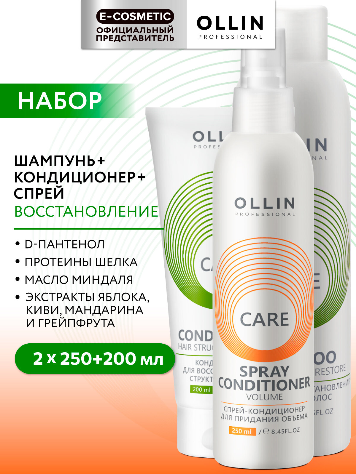 Набор для объема волос OLLIN PROFESSIONAL Care восстанавливающий: шампунь, кондиционер и спрей, 2*250+200 мл: сравнение цен, характеристики, фото, актуальное наличие и цены.