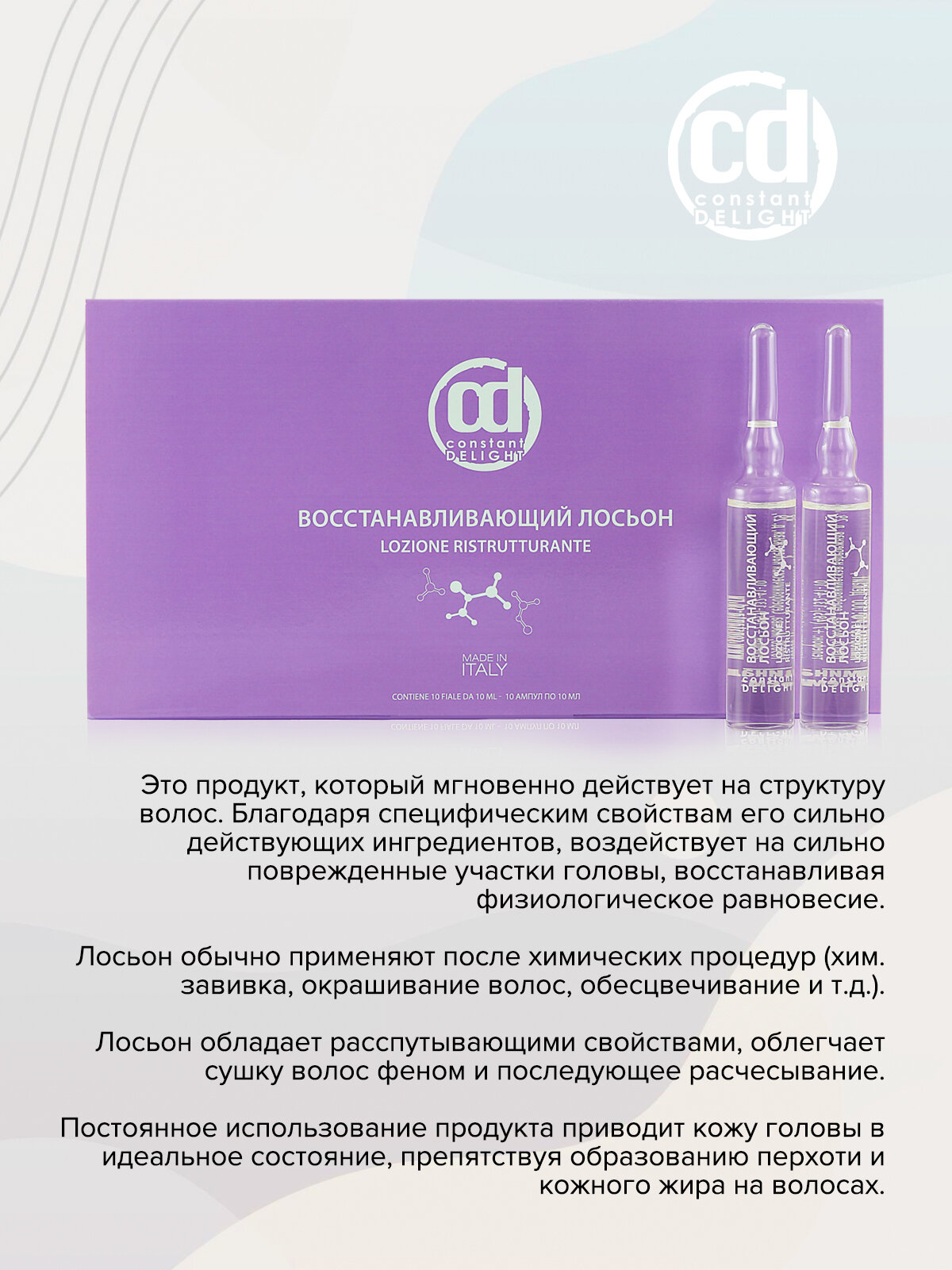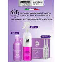 | Способ применения | Шампунь нанести на влажные волосы, вспенить 1-2 минуты. Смыть теплой водой. При необходимости повторить процедуру. Кондиционер тщательно встряхнуть, чтобы смешать две фазы. Распылить необходимое количество на чистые влажные волосы перед укладкой или во время укладки на расстоянии 20-30 см. Не смывать. Вымыть голову шампунем, просушить, затем нанести состав из ампулы лосьона массирующими движениями, оставить на 10 минут, обильно промыть теплой водой без использования шампуня и бальзама. |