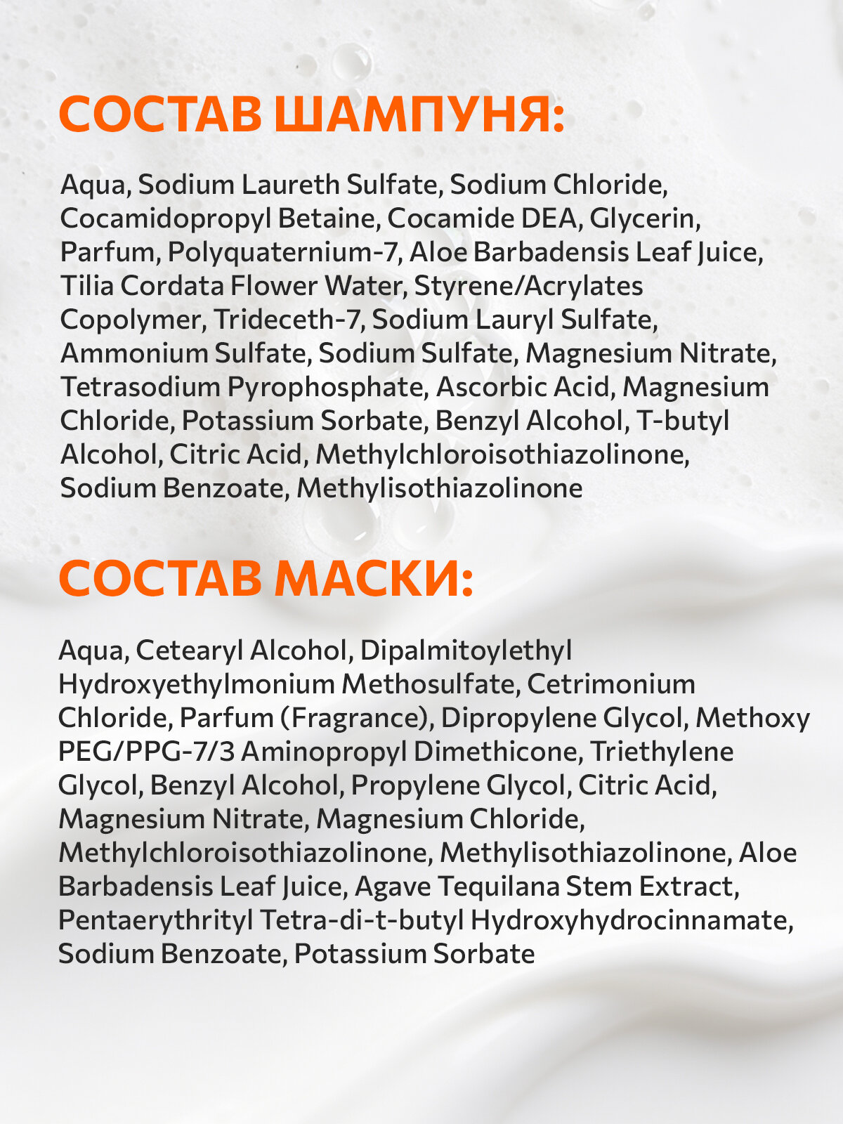 | Состав | Шампунь: Aqua, Sodium Laureth Sulfate, Sodium Chloride, Cocamidopropyl Betaine, Cocamide DEA, Glycerin, Parfum, Polyquaternium-7, Aloe Barbadensis Leaf Juice, Tilia Cordata Flower Water, Styrene/Acrylates Copolymer, Trideceth-7, Sodium Lauryl Sulfate, Ammonium Sulfate, Sodium Sulfate, Magnesium Nitrate, Tetrasodium Pyrophosphate, Ascorbic Acid, Magnesium Chloride, Potassium Sorbate, Benzyl Alcohol, T-butyl Alcohol, Citric Acid, Methylchloroisothiazolinone, Sodium Benzoate, Methylisothiazolinone. Маска: Aqua, Cetearyl Alcohol, Dipalmitoylethyl Hydroxyethylmonium Methosulfate, Cetrimonium Chloride, Parfum (Fragrance), Dipropylene Glycol, Methoxy PEG/PPG-7/3 Aminopropyl Dimethicone, Triethylene Glycol, Benzyl Alcohol, Propylene Glycol, Citric Acid, Magnesium Nitrate, Magnesium Chloride, Methylchloroisothiazolinone, Methylisothiazolinone, Aloe Barbadensis Leaf Juice, Agave Tequilana Stem Extract, Pentaerythrityl Tetra-di-t-butyl Hydroxyhydrocinnamate, Sodium Benzoate, Potassium Sorbate. |
