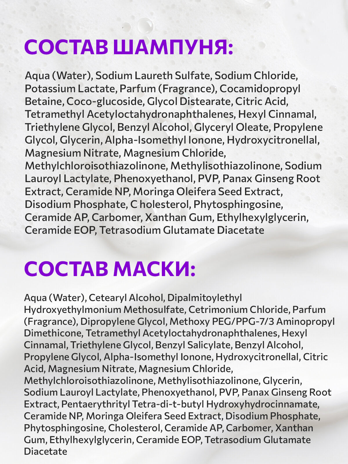 | Состав | Шампунь: Aqua (Water), Sodium Laureth Sulfate, Sodium Chloride, Potassium Lactate, Parfum (Fragrance), Cocamidopropyl Betaine, Coco-glucoside, Glycol Distearate, Citric Acid, Tetramethyl Acetyloctahydronaphthalenes, Hexyl Cinnamal, Triethylene Glycol, Benzyl Alcohol, Glyceryl Oleate, Propylene Glycol, Glycerin, Alpha-Isomethyl Ionone, Hydroxycitronellal, Magnesium Nitrate, Magnesium Chloride, Methylchloroisothiazolinone, Methylisothiazolinone, Sodium Lauroyl Lactylate, Phenoxyethanol, PVP, Panax Ginseng Root Extract, Ceramide NP, Moringa Oleifera Seed Extract, Disodium Phosphate, Cholesterol, Phytosphingosine, Ceramide AP, Carbomer, Xanthan Gum, Ethylhexylglycerin, Ceramide EOP, Tetrasodium Glutamate Diacetate. Маска: Aqua (Water), Cetearyl Alcohol, Dipalmitoylethyl Hydroxyethylmonium Methosulfate, Cetrimonium Chloride, Parfum (Fragrance), Dipropylene Glycol, Methoxy PEG/PPG-7/3 Aminopropyl Dimethicone, Tetramethyl Acetyloctahydronaphthalenes, Hexyl Cinnamal, Triethylene Glycol, Benzyl Salicylate, Benzyl Alcohol, Propylene Glycol, Alpha-Isomethyl Ionone, Hydroxycitronellal, Citric Acid, Magnesium Nitrate, Magnesium Chloride, Methylchloroisothiazolinone, Methylisothiazolinone, Glycerin, Sodium Lauroyl Lactylate, Phenoxyethanol, PVP, Panax Ginseng Root Extract, Pentaerythrityl Tetra-di-t-butyl Hydroxyhydrocinnamate, Ceramide NP, Moringa Oleifera Seed Extract, Disodium Phosphate, Phytosphingosine, Cholesterol, Ceramide AP, Carbomer, Xanthan Gum, Ethylhexylglycerin, Ceramide EOP, Tetrasodium Glutamate Diacetate. |