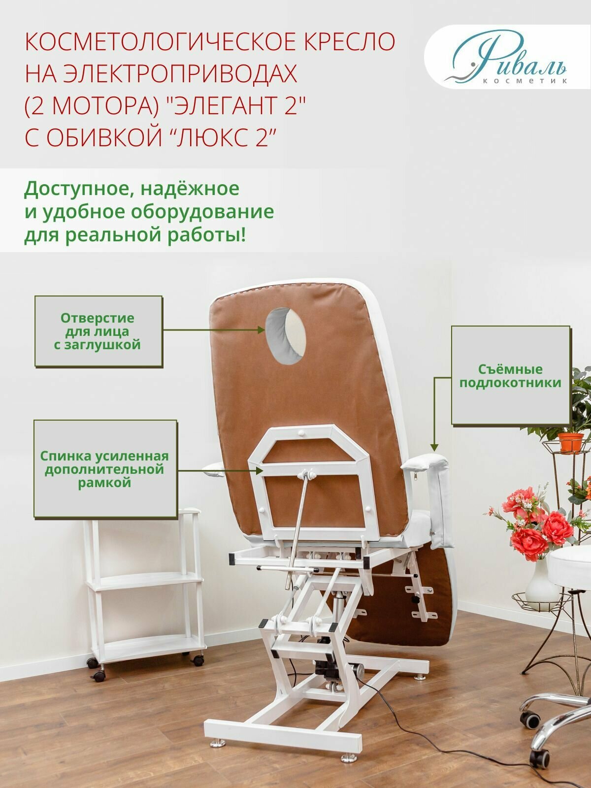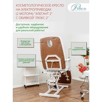 • Косметологическое кресло кушетка Элегант 2 с обивкой Люкс 2 с отверстием для лица, необходимое оборудование для косметолога, визажиста, эстетиста и других специалистов области красоты и является основным оснащением салонов красоты, парикмахерских и педикюрных кабинетов. • Кресло для косметологии Элегант 2 с обивкой Люкс 2 с отверстием для лица. • 2 мотора с регулировкой высоты и наклона спины на электроприводе. Для сохранения большей устойчивости, верхняя платформа установлена на специальном пантографическом механизме, с помощью которого осуществляется подъем и опускание на высоту 16 см. • Кресло имеет очень удобную, большую (длиной 180 см), широкую (64 см), и толстую (11 см) обивку, со съемными подлокотниками, имеет прочный и устойчивый каркас. • Подъем и фиксация спины и ножных частей производится надежным механическим способом. Быстрая и простая сборка по инструкции. • Рассчитано на нагрузку до 200 кг. • Гарантия 24 мес. • Для того что бы обивка дольше сохраняла хороший внешний вид, его можно защитить специальным многоразовым чехлом для косметологического кресла. • Для поверхностей нашего кресла применяется качественная «дышащая» экокожа производства Турции, специально разработанная для интенсивного использования, не подвержено порчи и появлению пятен при использовании активных средств как для косметологии, так и для подологии и педикюра. • Наше кресло может быть разложено в качестве кушетки и может применено как для косметологии, так и для нанесения тату, для массажа, так и для педикюра. А так же успешно применено для работы визажистов, эстетистов с бровями и по наращиванию ресниц. Широкая и удлиненная спинная часть предоставляет дополнительные удобства специалисту (положить руки, косметические средства и препараты и т. д), для выполнения макияжа (мейкап) лица, визажа и др манипуляции с лицом и шеей.