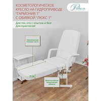 · Гидравлическое косметологическое кресло кушетка Гармония-1 с обивкой Люкс-1, необходимое оборудование для косметолога и является основным оснащением салонов красоты и косметологических кабинетов. · Кресло косметологическое «Гармония 1» с регулировкой высоты на гидроподъёмнике. · Нижнее положение 66 см. верхнее 82 см. · При нахождении кресла в сидячем положении его можно вращать на 360 градусов вокруг своей оси, что позволяет развернуть его к клиенту во время посадки. · Кресло можно зафиксировать в нужном положении. · Изменяемая высота кресла позволяет обеспечить высокий уровень комфорта во время посадки человека и осуществить его подъем на нужную для работы высоту. · Кресло рассчитано на нагрузку до 200кг. · Регулировка угла наклона спины и ног, механическая. · Усилены узлы крепления всех отклоняющихся частей каркаса (спина и ноги). Ножные части прикреплены к специальным металлическим держателям, которые в свою очередь прикреплены к основанию кресла. В отличии от других моделей, такое решение делает данный ответственный узел более прочным и долговечным. Все крепления выполнены на винтовых соединениях. Обивка Люкс 1 — обивка имеет увеличенную толщину 10 см и плотность по всей длине ложа, наполнитель специальный поролон средней жесткости. Покрытие обивки, матовая, не скользящая, высококачественная, износостойкая, «дышащая» экокожа производство Турции (50000 циклов, 100% PU полиуретан). Ширина ложа 64 см, длина 180 см. Съемные подлокотники. · Для того что бы обивка дольше сохраняла хороший внешний вид, его можно защитить специальным многоразовым чехлом для косметологического кресла. · Для поверхностей нашего кресла применяется качественная «дышащая» экокожа производства Турции, специально разработанная для интенсивного использования, не подвержено порчи и появлению пятен при использовании активных · Наше кресло может быть разложено в качестве кушетки и может применено как для педикюра, для подологии, нанесения тату, для массажа, так и для наращивания ресниц и для визажа. А так же успешно применено как косметологическое кресло, для работы визажистов, эстетистов с бровями и по наращиванию ресниц. · Широкая и удлиненная спинная часть предоставляет дополнительные удобства мастеру, для выполнения макияжа (мейкап) лица, визажа и других манипуляций с шеей и лицом клиента.