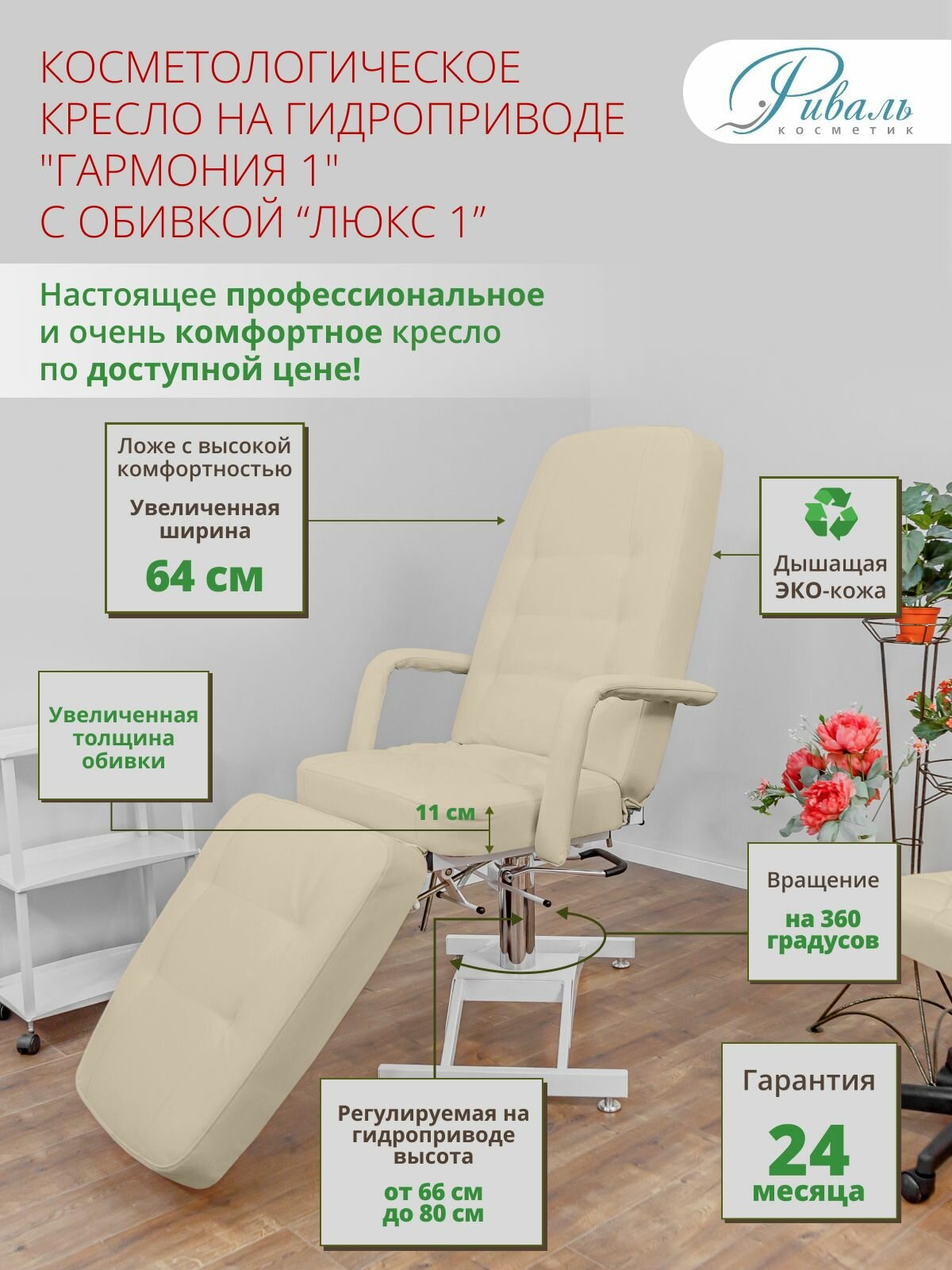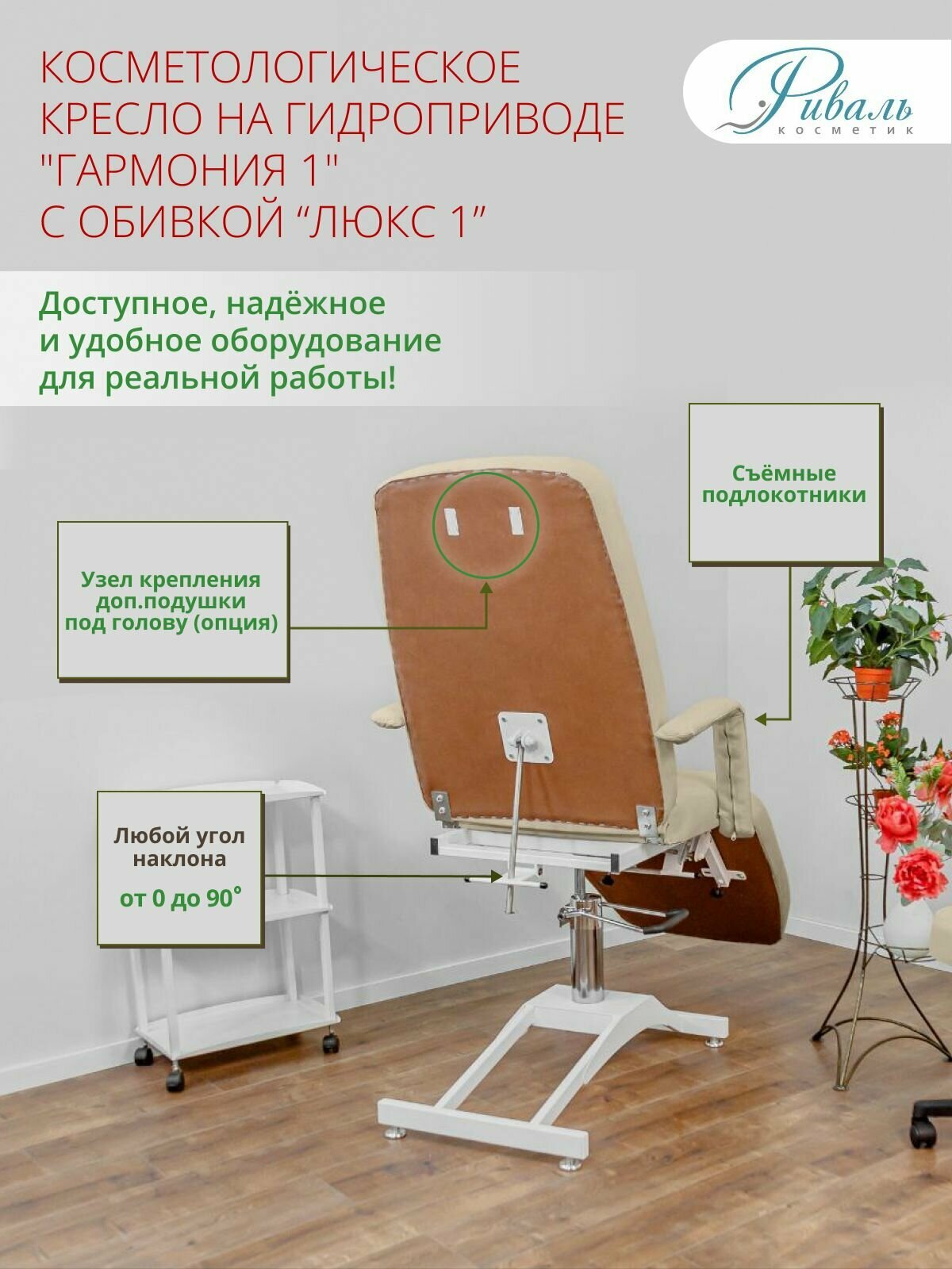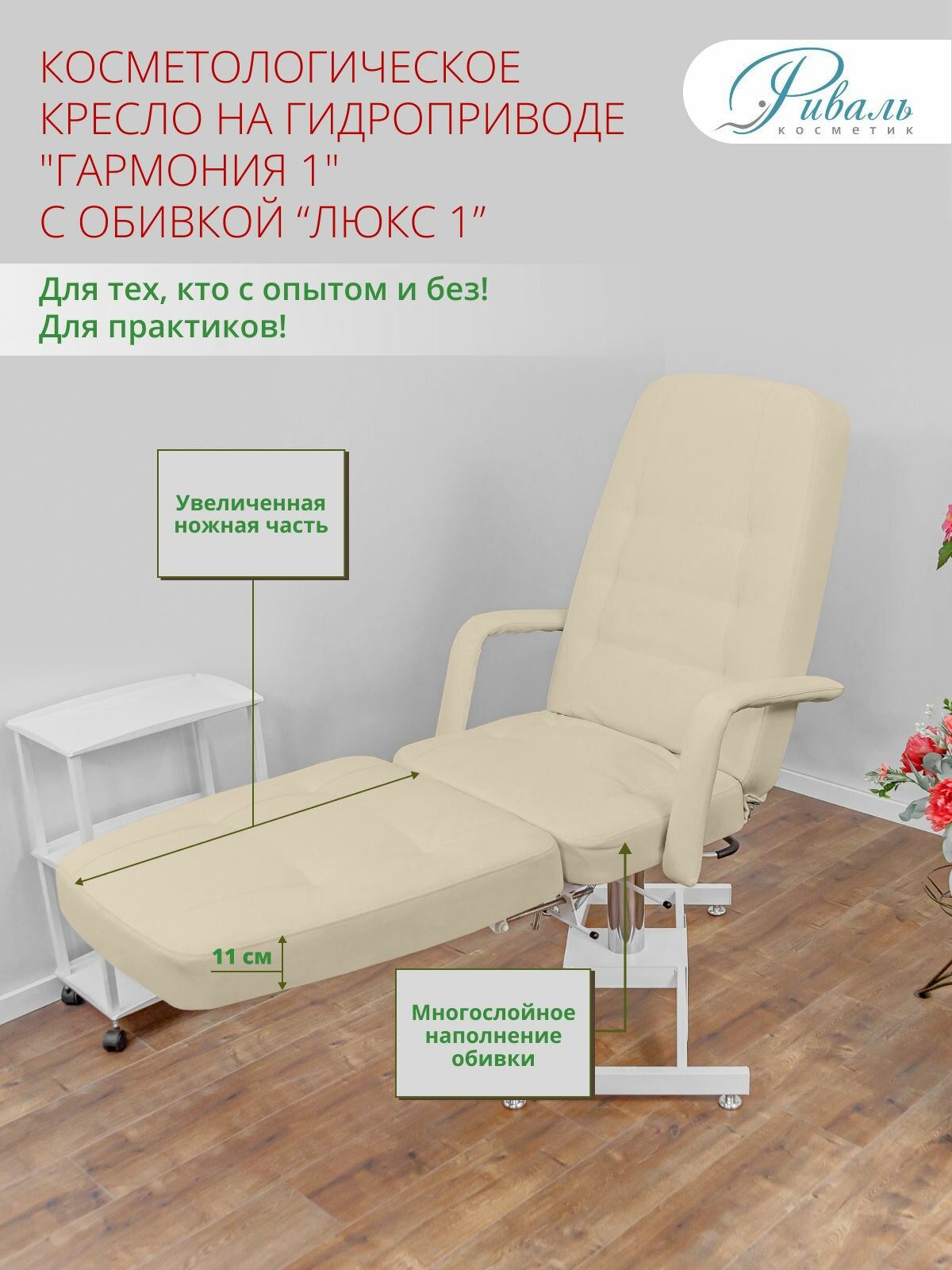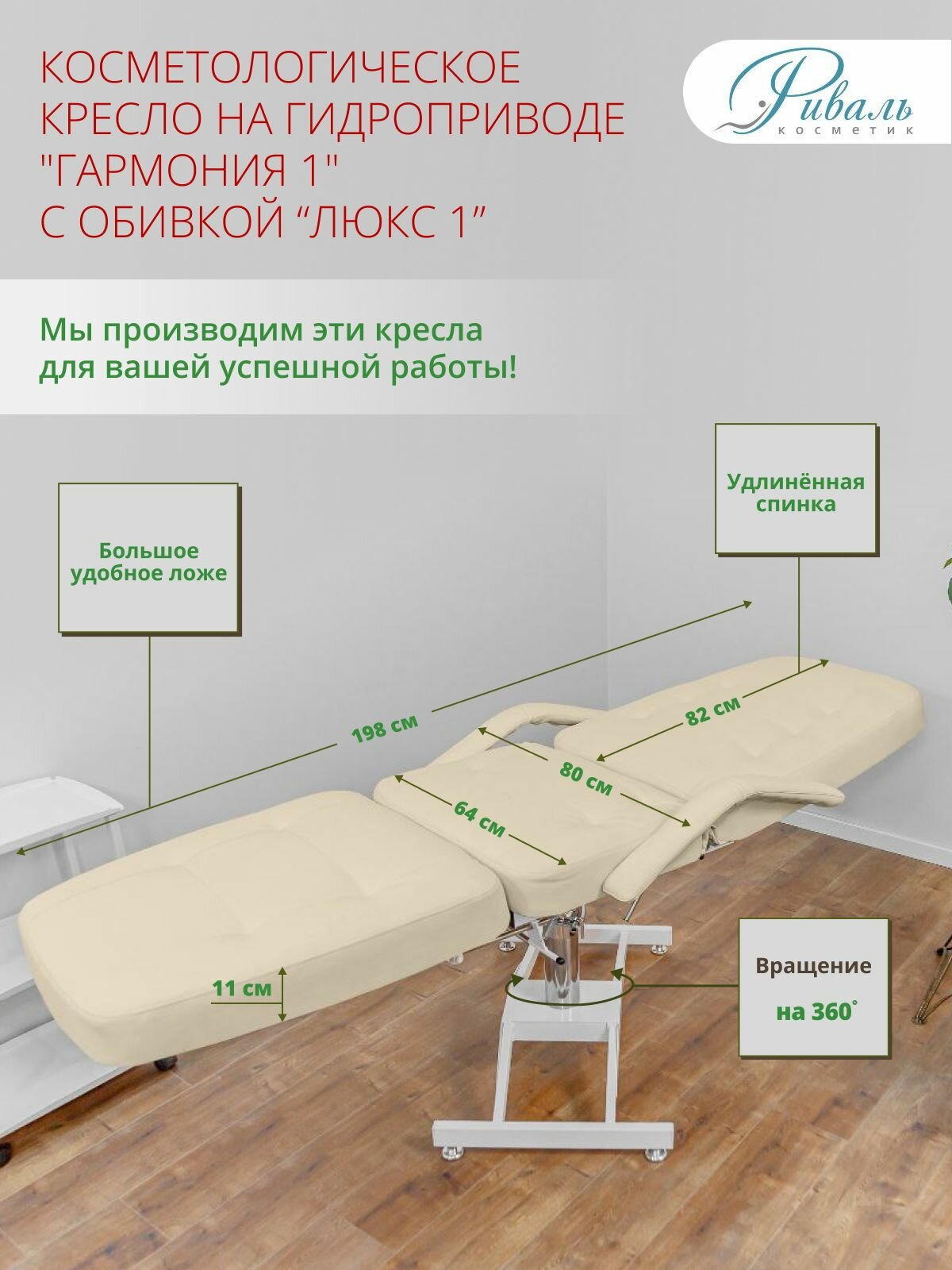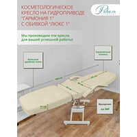 · Гидравлическое косметологическое кресло кушетка Гармония-1 с обивкой Люкс-1, необходимое оборудование для косметолога и является основным оснащением салонов красоты и косметологических кабинетов. · Кресло косметологическое «Гармония 1» с регулировкой высоты на гидроподъёмнике. · Нижнее положение 66 см. верхнее 82 см. · При нахождении кресла в сидячем положении его можно вращать на 360 градусов вокруг своей оси, что позволяет развернуть его к клиенту во время посадки. · Кресло можно зафиксировать в нужном положении. · Изменяемая высота кресла позволяет обеспечить высокий уровень комфорта во время посадки человека и осуществить его подъем на нужную для работы высоту. · Кресло рассчитано на нагрузку до 200кг. · Регулировка угла наклона спины и ног, механическая. · Усилены узлы крепления всех отклоняющихся частей каркаса (спина и ноги). Ножные части прикреплены к специальным металлическим держателям, которые в свою очередь прикреплены к основанию кресла. В отличии от других моделей, такое решение делает данный ответственный узел более прочным и долговечным. Все крепления выполнены на винтовых соединениях. Обивка Люкс 1 — обивка имеет увеличенную толщину 10 см и плотность по всей длине ложа, наполнитель специальный поролон средней жесткости. Покрытие обивки, матовая, не скользящая, высококачественная, износостойкая, «дышащая» экокожа производство Турции (50000 циклов, 100% PU полиуретан). Ширина ложа 64 см, длина 198 см. Съемные подлокотники. · Для того что бы обивка дольше сохраняла хороший внешний вид, его можно защитить специальным многоразовым чехлом для косметологического кресла. · Для поверхностей нашего кресла применяется качественная «дышащая» экокожа производства Турции, специально разработанная для интенсивного использования, не подвержено порчи и появлению пятен при использовании активных · Наше кресло может быть разложено в качестве кушетки и может применено как для педикюра, для подологии, нанесения тату, для массажа, так и для наращивания ресниц и для визажа. А так же успешно применено как косметологическое кресло, для работы визажистов, эстетистов с бровями и по наращиванию ресниц. · Широкая и удлиненная спинная часть предоставляет дополнительные удобства мастеру, для выполнения макияжа (мейкап) лица, визажа и других манипуляций с шеей и лицом клиента.