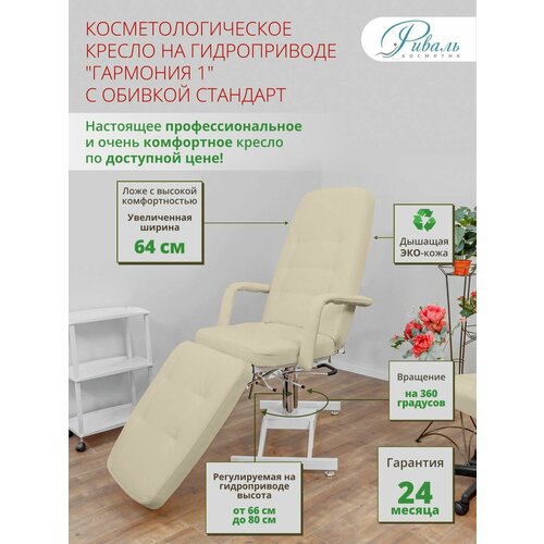· Гидравлическое косметологическое кресло кушетка Гармония-1 с обивкой Стандарт, необходимое оборудование для косметолога и является основным оснащением салонов красоты и косметологических кабинетов. · Кресло косметологическое «Гармония 1» с регулировкой высоты на гидроподъёмнике. · Нижнее положение 66 см. верхнее 82 см. · При нахождении кресла в сидячем положении его можно вращать на 360 градусов вокруг своей оси, что позволяет развернуть его к клиенту во время посадки. · Кресло можно зафиксировать в нужном положении. · Изменяемая высота кресла позволяет обеспечить высокий уровень комфорта во время посадки человека и осуществить его подъем на нужную для работы высоту. · Кресло рассчитано на нагрузку до 200кг. · Регулировка угла наклона спины и ног, механическая. · Усилены узлы крепления всех отклоняющихся частей каркаса (спина и ноги). Ножные части прикреплены к специальным металлическим держателям, которые в свою очередь прикреплены к основанию кресла. В отличии от других моделей, такое решение делает данный ответственный узел более прочным и долговечным. Все крепления выполнены на винтовых соединениях. Обивка СТАНДАРТ — обивка имеет одинаковую толщину 8,5 см и плотность по всей длине ложа, наполнитель специальный поролон средней жесткости. Покрытие обивки, матовая, не скользящая, высококачественная, износостойкая, «дышащая» экокожа производство Турции (50000 циклов, 100% PU полиуретан). Ширина ложа 64 см, длина 180 см. Съемные подлокотники. · Для того что бы обивка дольше сохраняла хороший внешний вид, его можно защитить специальным многоразовым чехлом для косметологического кресла. · Для поверхностей нашего кресла применяется качественная «дышащая» экокожа производства Турции, специально разработанная для интенсивного использования, не подвержено порчи и появлению пятен при использовании активных · Наше кресло может быть разложено в качестве кушетки и может применено как для педикюра, для подологии, нанесения тату, для массажа, так и для наращивания ресниц и для визажа. А так же успешно применено как косметологическое кресло, для работы визажистов, эстетистов с бровями и по наращиванию ресниц. · Широкая и удлиненная спинная часть предоставляет дополнительные удобства мастеру, для выполнения макияжа (мейкап) лица, визажа и других манипуляций с шеей и лицом клиента.