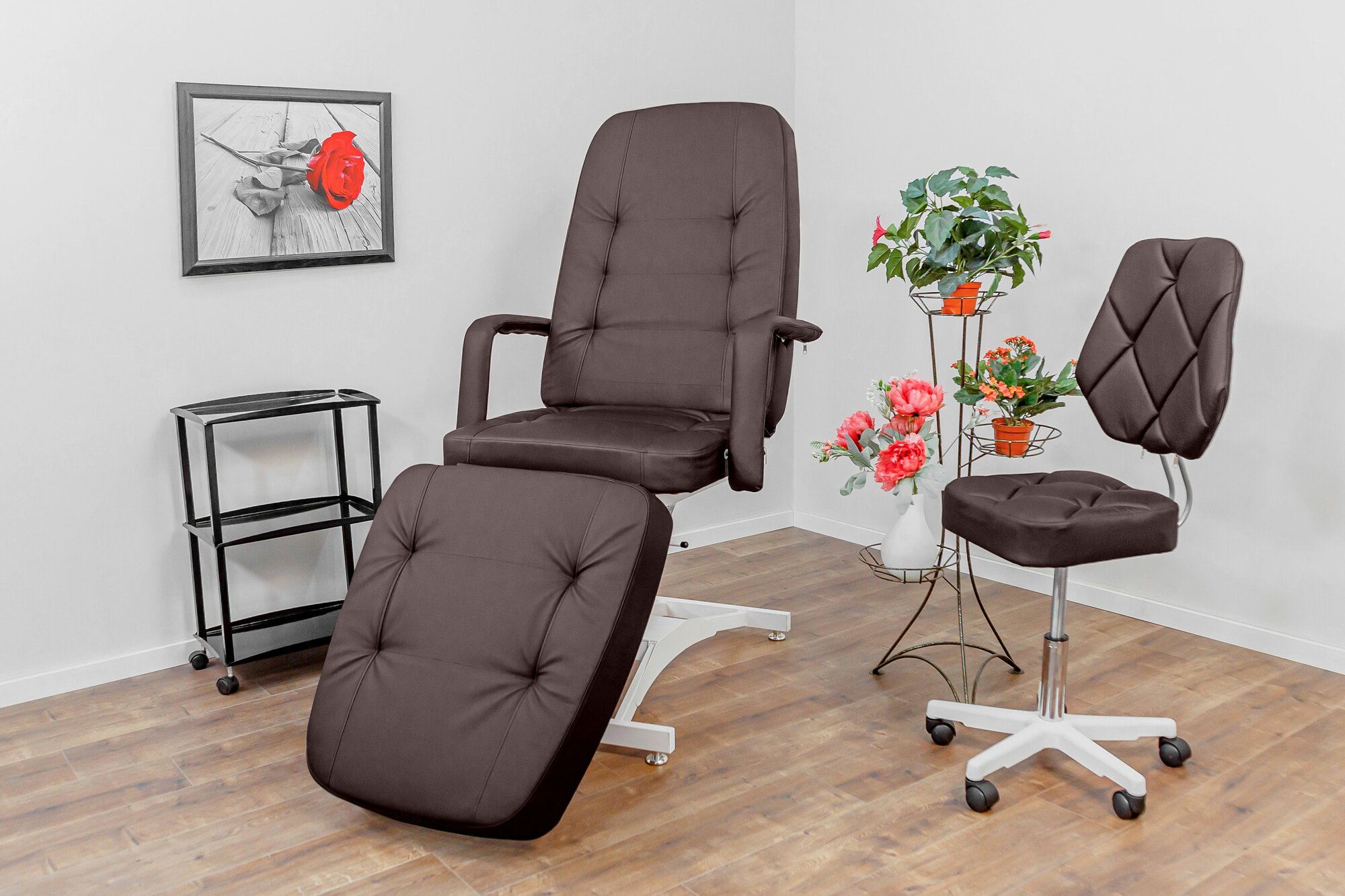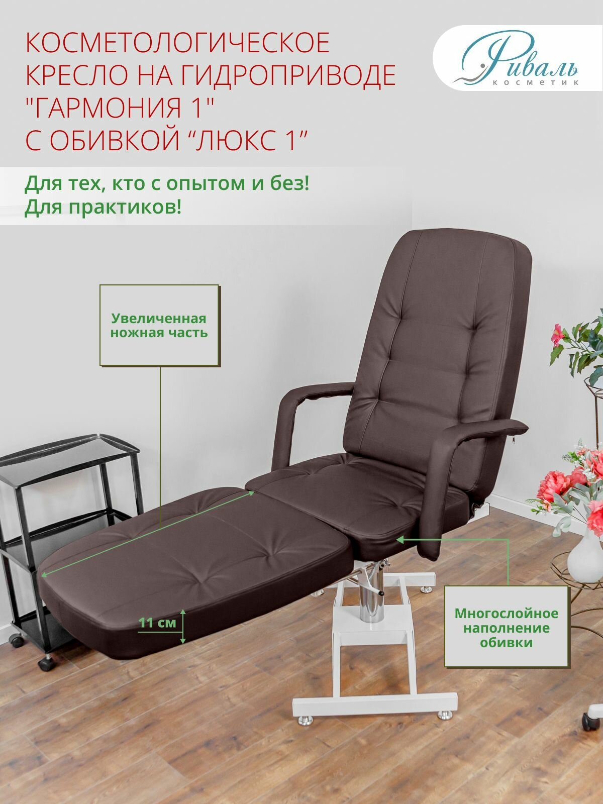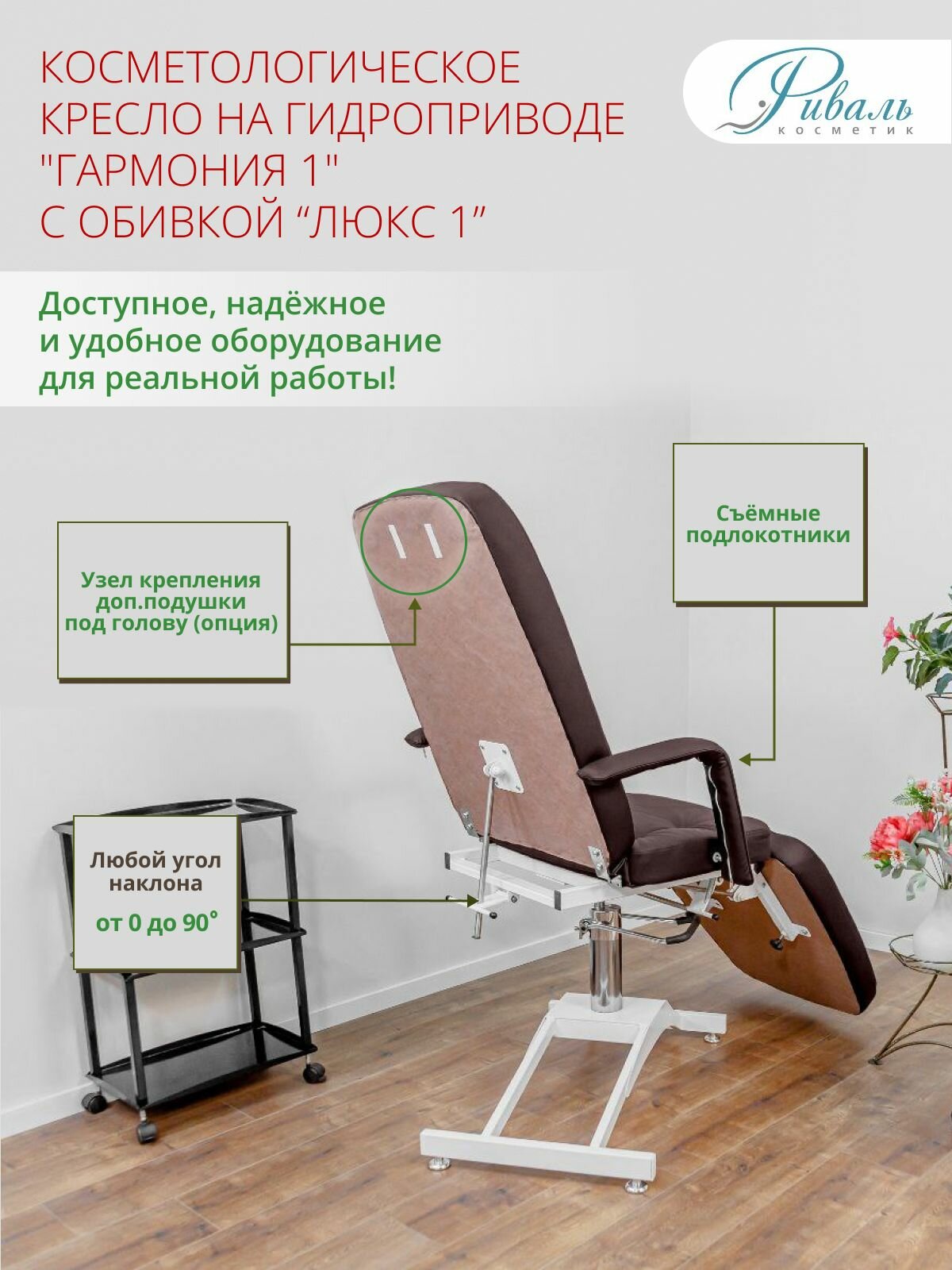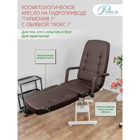 · Гидравлическое косметологическое кресло кушетка Гармония-1 с обивкой Люкс-1, необходимое оборудование для косметолога и является основным оснащением салонов красоты и косметологических кабинетов. · Кресло косметологическое «Гармония 1» с регулировкой высоты на гидроподъёмнике. · Нижнее положение 66 см. верхнее 82 см. · При нахождении кресла в сидячем положении его можно вращать на 360 градусов вокруг своей оси, что позволяет развернуть его к клиенту во время посадки. · Кресло можно зафиксировать в нужном положении. · Изменяемая высота кресла позволяет обеспечить высокий уровень комфорта во время посадки человека и осуществить его подъем на нужную для работы высоту. · Кресло рассчитано на нагрузку до 200кг. · Регулировка угла наклона спины и ног, механическая. · Усилены узлы крепления всех отклоняющихся частей каркаса (спина и ноги). Ножные части прикреплены к специальным металлическим держателям, которые в свою очередь прикреплены к основанию кресла. В отличии от других моделей, такое решение делает данный ответственный узел более прочным и долговечным. Все крепления выполнены на винтовых соединениях. Обивка Люкс 1 — обивка имеет увеличенную толщину 10 см и плотность по всей длине ложа, наполнитель специальный поролон средней жесткости. Покрытие обивки, матовая, не скользящая, высококачественная, износостойкая, «дышащая» экокожа производство Турции (50000 циклов, 100% PU полиуретан). Ширина ложа 64 см, длина 180 см. Съемные подлокотники. · Для того что бы обивка дольше сохраняла хороший внешний вид, его можно защитить специальным многоразовым чехлом для косметологического кресла. · Для поверхностей нашего кресла применяется качественная «дышащая» экокожа производства Турции, специально разработанная для интенсивного использования, не подвержено порчи и появлению пятен при использовании активных · Наше кресло может быть разложено в качестве кушетки и может применено как для педикюра, для подологии, нанесения тату, для массажа, так и для наращивания ресниц и для визажа. А так же успешно применено как косметологическое кресло, для работы визажистов, эстетистов с бровями и по наращиванию ресниц. · Широкая и удлиненная спинная часть предоставляет дополнительные удобства мастеру, для выполнения макияжа (мейкап) лица, визажа и других манипуляций с шеей и лицом клиента.
