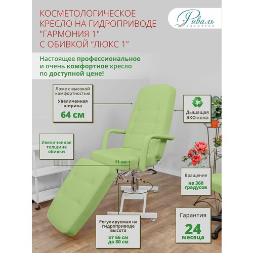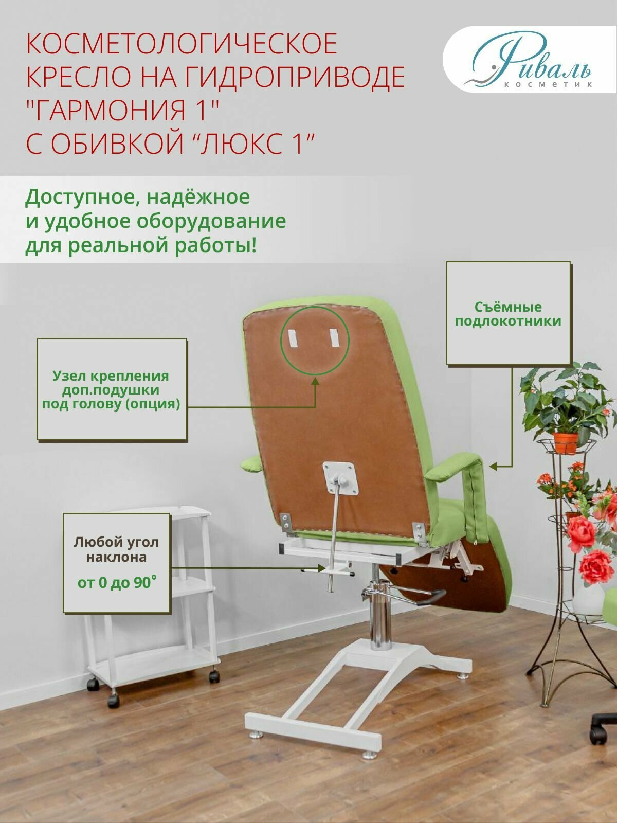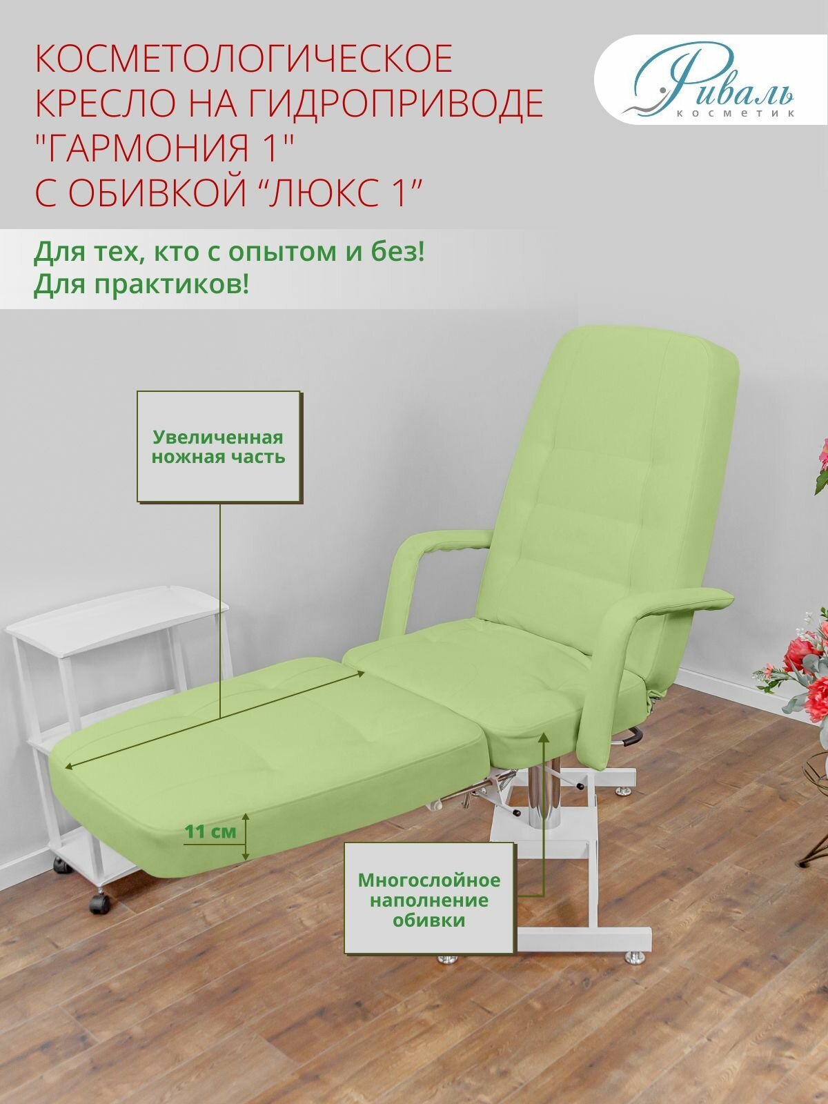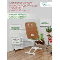 · Гидравлическое косметологическое кресло кушетка Гармония-1 с обивкой Люкс-1, необходимое оборудование для косметолога и является основным оснащением салонов красоты и косметологических кабинетов. · Кресло косметологическое «Гармония 1» с регулировкой высоты на гидроподъёмнике. · Нижнее положение 66 см. верхнее 82 см. · При нахождении кресла в сидячем положении его можно вращать на 360 градусов вокруг своей оси, что позволяет развернуть его к клиенту во время посадки. · Кресло можно зафиксировать в нужном положении. · Изменяемая высота кресла позволяет обеспечить высокий уровень комфорта во время посадки человека и осуществить его подъем на нужную для работы высоту. · Кресло рассчитано на нагрузку до 200кг. · Регулировка угла наклона спины и ног, механическая. · Усилены узлы крепления всех отклоняющихся частей каркаса (спина и ноги). Ножные части прикреплены к специальным металлическим держателям, которые в свою очередь прикреплены к основанию кресла. В отличии от других моделей, такое решение делает данный ответственный узел более прочным и долговечным. Все крепления выполнены на винтовых соединениях. Обивка Люкс 1 — обивка имеет увеличенную толщину 10 см и плотность по всей длине ложа, наполнитель специальный поролон средней жесткости. Покрытие обивки, матовая, не скользящая, высококачественная, износостойкая, «дышащая» экокожа производство Турции (50000 циклов, 100% PU полиуретан). Ширина ложа 64 см, длина 198 см. Съемные подлокотники. · Для того что бы обивка дольше сохраняла хороший внешний вид, его можно защитить специальным многоразовым чехлом для косметологического кресла. · Для поверхностей нашего кресла применяется качественная «дышащая» экокожа производства Турции, специально разработанная для интенсивного использования, не подвержено порчи и появлению пятен при использовании активных · Наше кресло может быть разложено в качестве кушетки и может применено как для педикюра, для подологии, нанесения тату, для массажа, так и для наращивания ресниц и для визажа. А так же успешно применено как косметологическое кресло, для работы визажистов, эстетистов с бровями и по наращиванию ресниц. · Широкая и удлиненная спинная часть предоставляет дополнительные удобства мастеру, для выполнения макияжа (мейкап) лица, визажа и других манипуляций с шеей и лицом клиента.