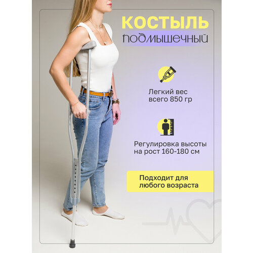 Костыли подмышечные для взрослых и детей – это ортопедическое средство, применяемое в восстановительный период после сильных ушибов, переломов, вывихов и других травм нижних конечностей. Также они применяются при нарушении опорно-двигательных функций. Костыль с опорой под мышки помогает перенести вес тела на руки. Они полностью разгружают поврежденную ногу, позволяя ходить, не опираясь на нее. Обычно они требуются тем больным, у кого слабые мышцы рук или большой вес тела. Медицинское приспособления необходимо также в начальный период восстановления после травмы. Они изготовлены из алюминиевого сплава, что делает его прочными и легкими, но при этом выдерживают нагрузку до 115 кг. Высота может легко регулироваться под рост пользователя с помощью кнопочного фиксатора, а количество уровней регулировки составляет - 9 уровней. Так же имеется возможность регулировать расстояние от подмышечной опоры до ручки захвата. Костыль взрослый оснащен специальным встроенным противоскользящим устройством, что обеспечивает комфортную эксплуатацию в зимнее время. Резиновые рукоять и подмышечный упор не проскальзывают и гарантируют надежную фиксацию в руке и подмышкой. Это идеальный опорный элемент для тех, кто нуждается в поддержке при реабилитации и для всех, кому важно свое здоровье и комфорт при передвижении. Он может применяться как детскому, так и взрослому пациенту. Не позволяйте ограниченной мобильности сдерживать Вас и Ваших близких - ощутите свободу движения с нашим товарами.