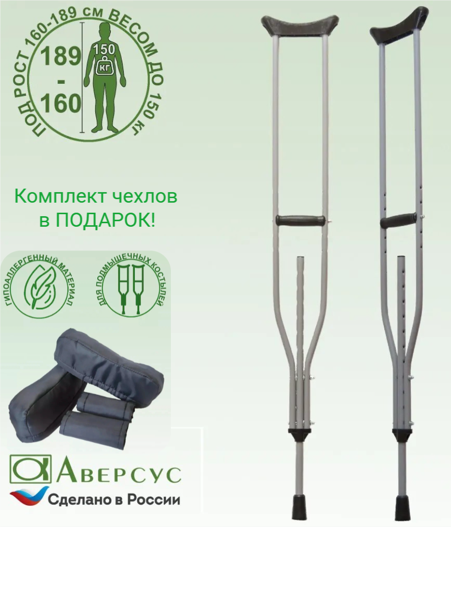 Стойки и ножки костылей изготовлены из стального проката, подмышечник и ручка из пластмассы. В качестве защитного покрытия используется порошковое напыление. Резиновый наконечник имеет внутренний диаметр 19 мм, внешний 30 мм. Выдерживают нагрузку до 100 кг. Высота костыля регулируется путем перестановки ножки. Шаг изменения высоты 35 mm.MIN 1280, MAX 1420 mm. Вес пары костылей – 2,4кг