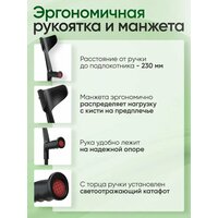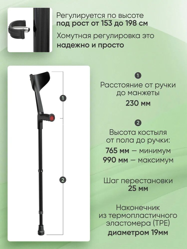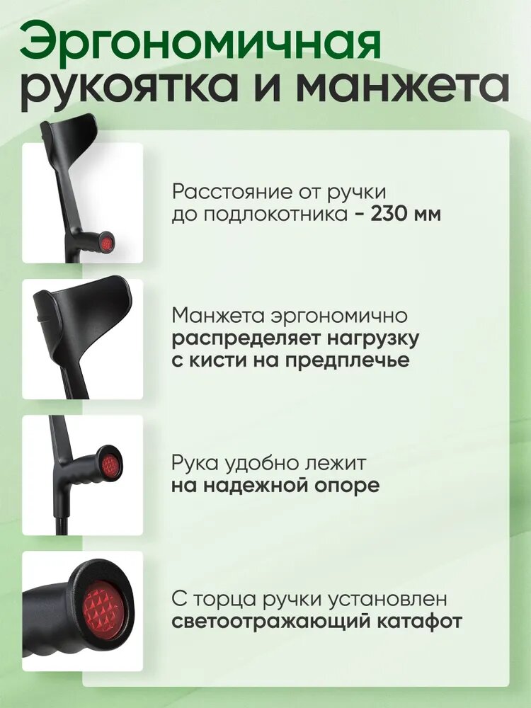 Костыли с опорой под локоть предназначены для дополнительной опоры и облегчения передвижения людей имеющих травмы и заболевания нижних конечностей. Нет данных о противопоказаниях. алюминиевый сплав, пластик. Стойка костыля изготовлена из труб алюминиевого сплава диаметром 22 и 19 мм В качестве защитного покрытия используется цветное анодирование либо применяется метод порошкового напыления. Подлокотник из пластмассы. Серийно выпускаются костыли черного и серого цветов (при порошковом напылении) или -жемчуг- и -светлое золото- (при цветном анодировании). Костыль оснащается резиновым, или изготовленным из пластиката, наконечником, с внутренним диаметром 19 мм, внешним 40 мм. Шаг перестановки ножки-25мм. Вес костыля: 0.54 кг. Выдерживают нагрузку до 100 кг. Диапазон регулировки высоты костыля: Высота костыля от пола до ручки: Мин-765 mm, Макс-990 mm. Размер от ручки до подлокотника: 230 mm. Костыль с регулируемой ножкой для взрослых. Разрешается использовать во время беременности. Для регулирования высоты ножки костыля необходимо: вынуть специальный хомут, переставить ножку на требуемую высоту (так чтобы отверстия в трубах совпали), вставить хомут. Перед применением проконсультируйтесь с врачом. Без рецепта.